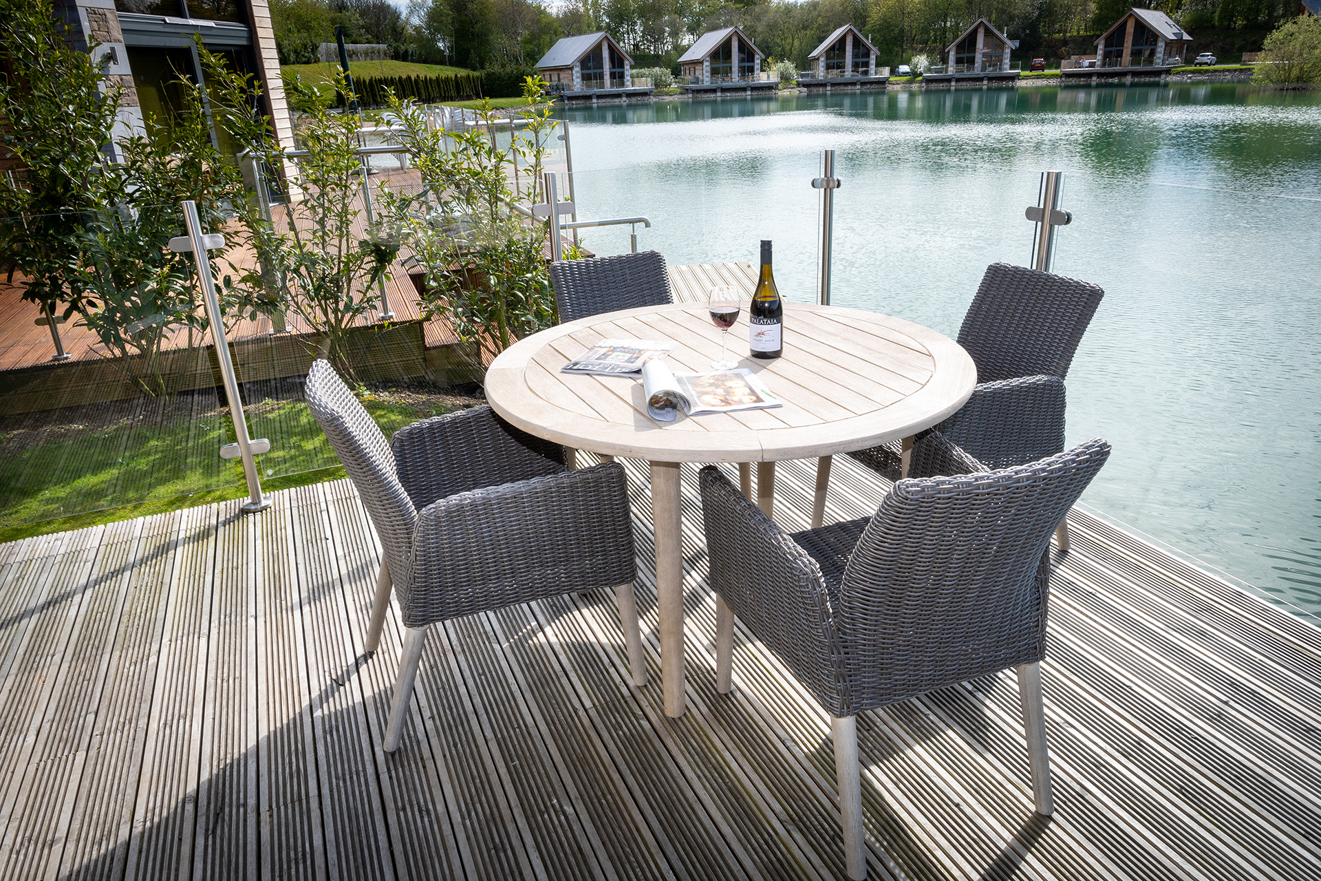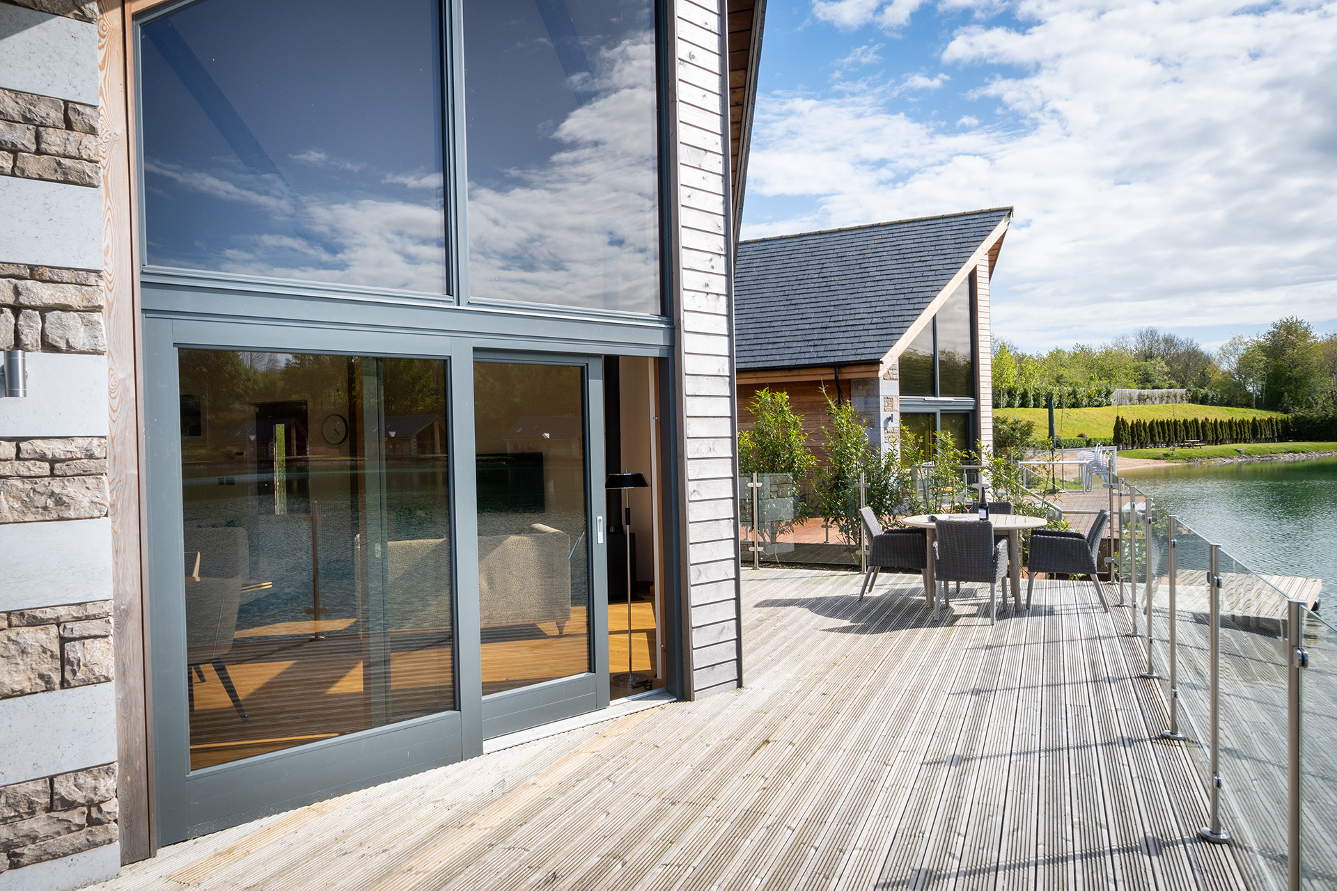 Lakeside enjoys a very contemporary spacious living space with a double height sitting room. The interior designer owners have created a luxurious and special interior. It is comfortable and airy with access through sliding patio doors onto the decking where you will find outdoor dining furniture and the hot tub.