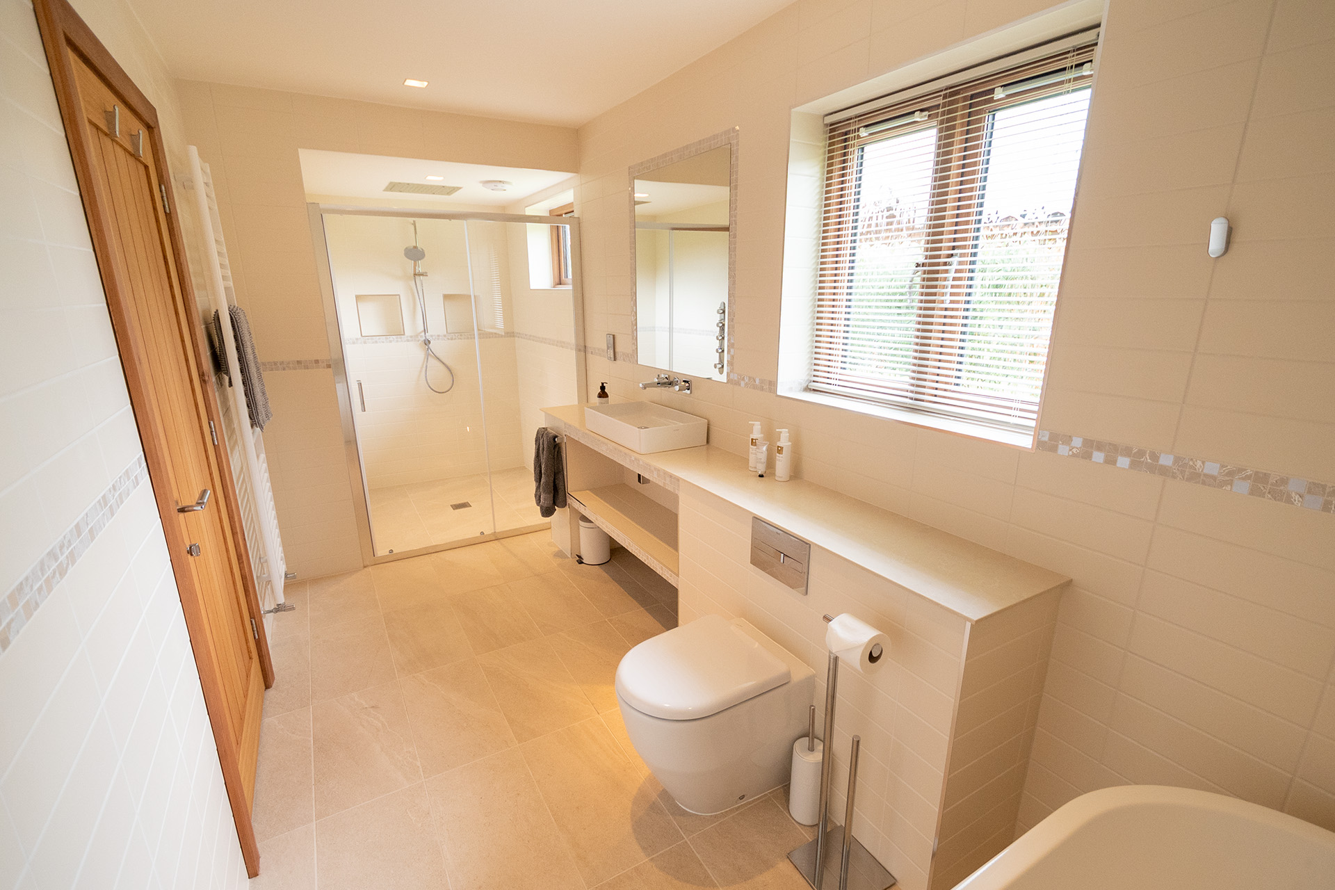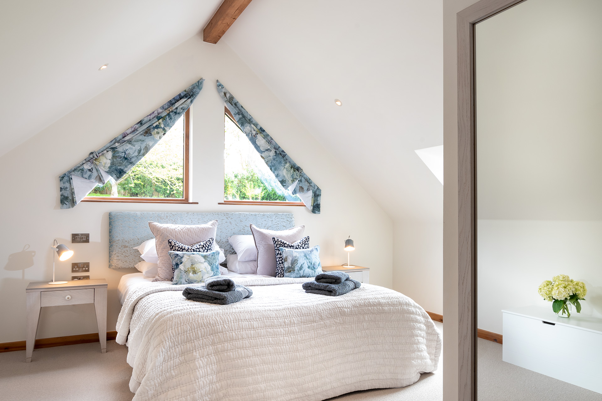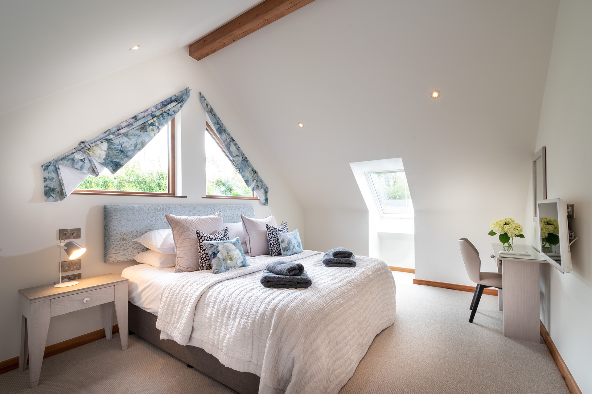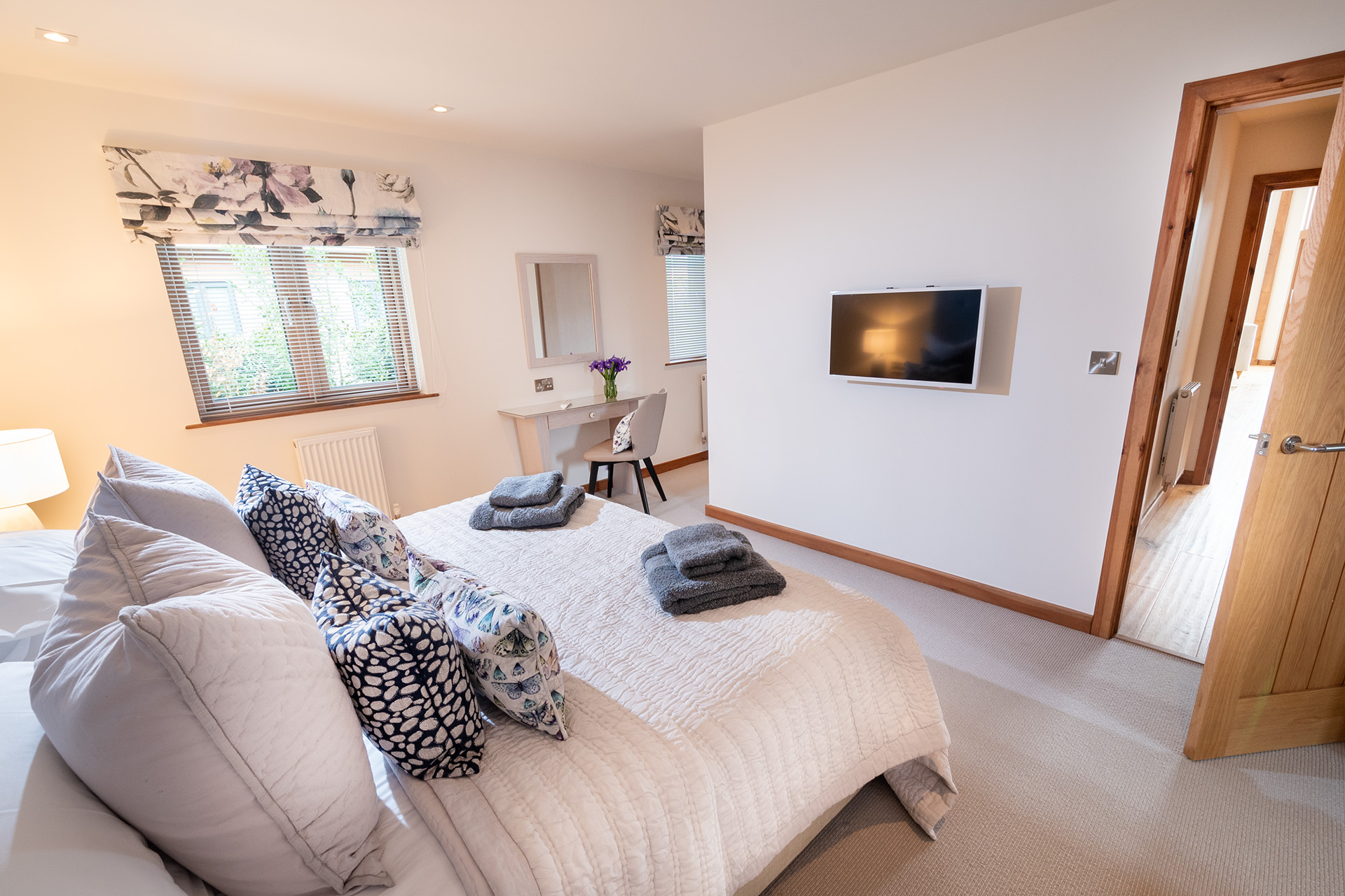 There are two spacious bedroom suites, one on each floor. Both of these have super-king beds, dressing area and en-suite bathrooms with huge walk-in rain showers. The ground floor bedroom has a superb spa-style shower area for the ultimate shower experience as well as a free-standing bath. Each bedroom has a wall mounted Smart TV.