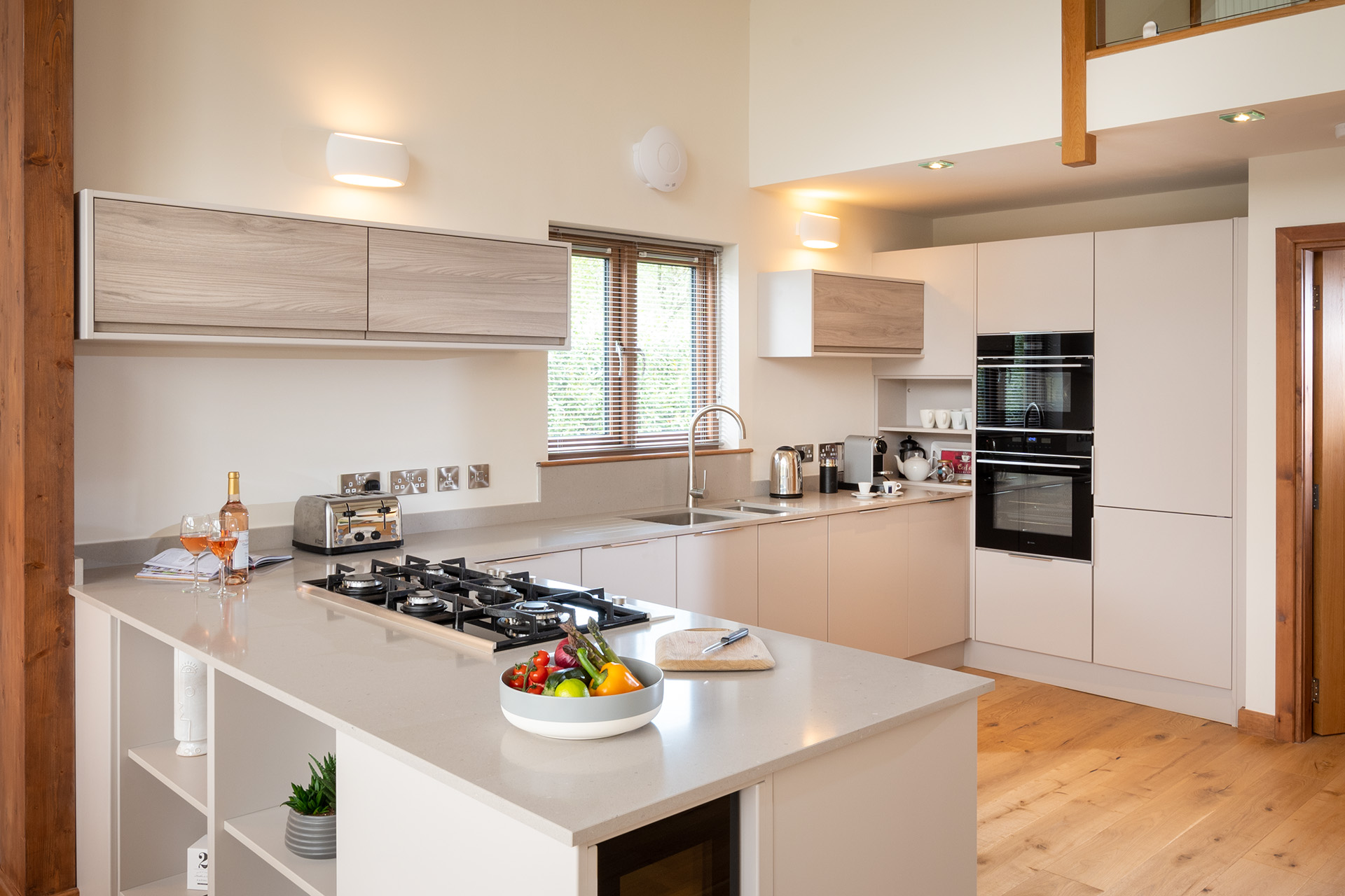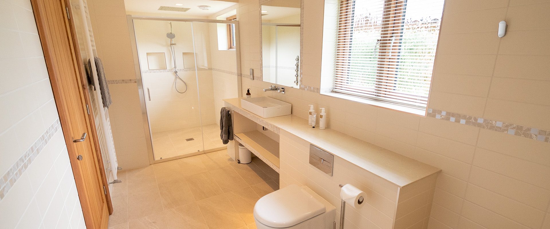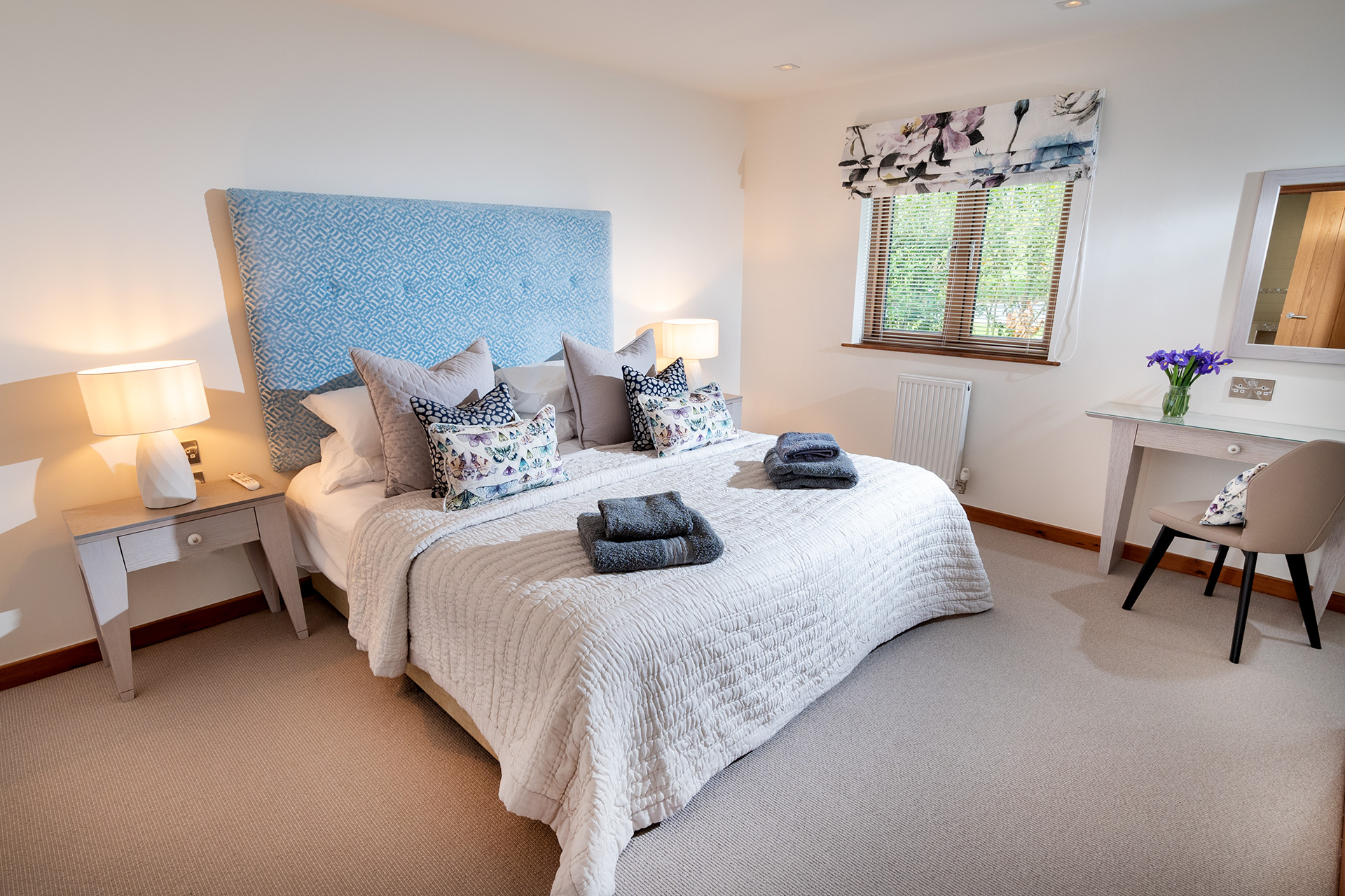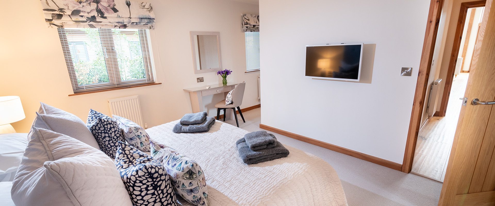 There are two spacious bedroom suites, one on each floor. Both of these have super-king beds, dressing area and en-suite bathrooms with huge walk-in rain showers. The ground floor bedroom has a superb spa-style shower area for the ultimate shower experience as well as a free-standing bath. Each bedroom has a wall mounted Smart TV.