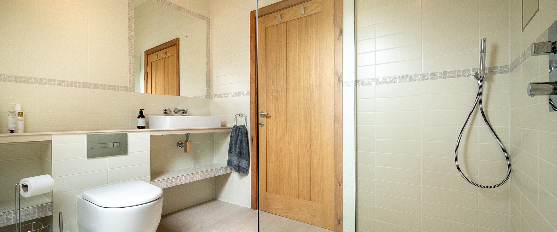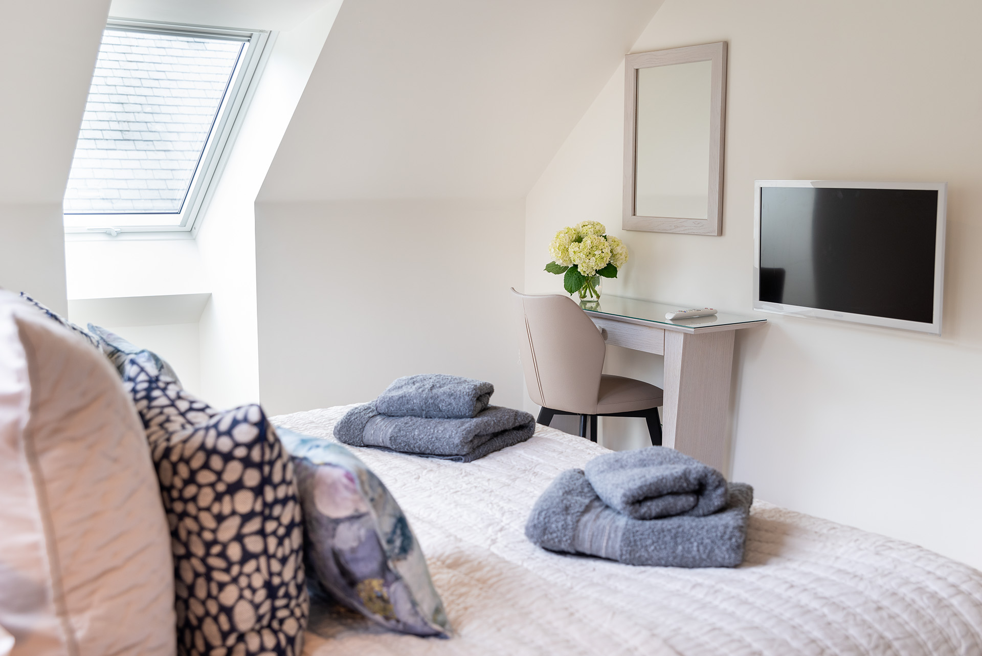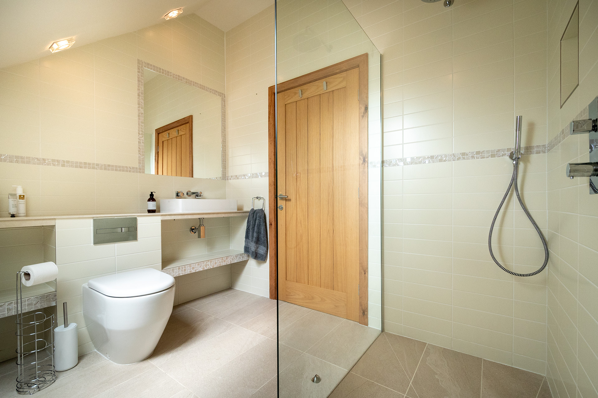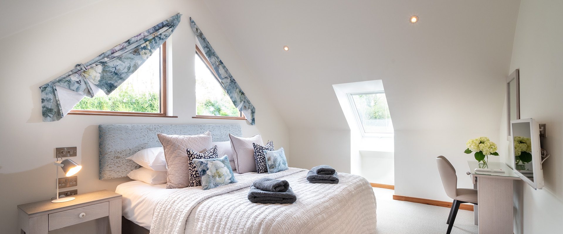 There are two spacious bedroom suites, one on each floor. Both of these have super-king beds, dressing area and en-suite bathrooms with huge walk-in rain showers. The ground floor bedroom has a superb spa-style shower area for the ultimate shower experience as well as a free-standing bath. Each bedroom has a wall mounted Smart TV.