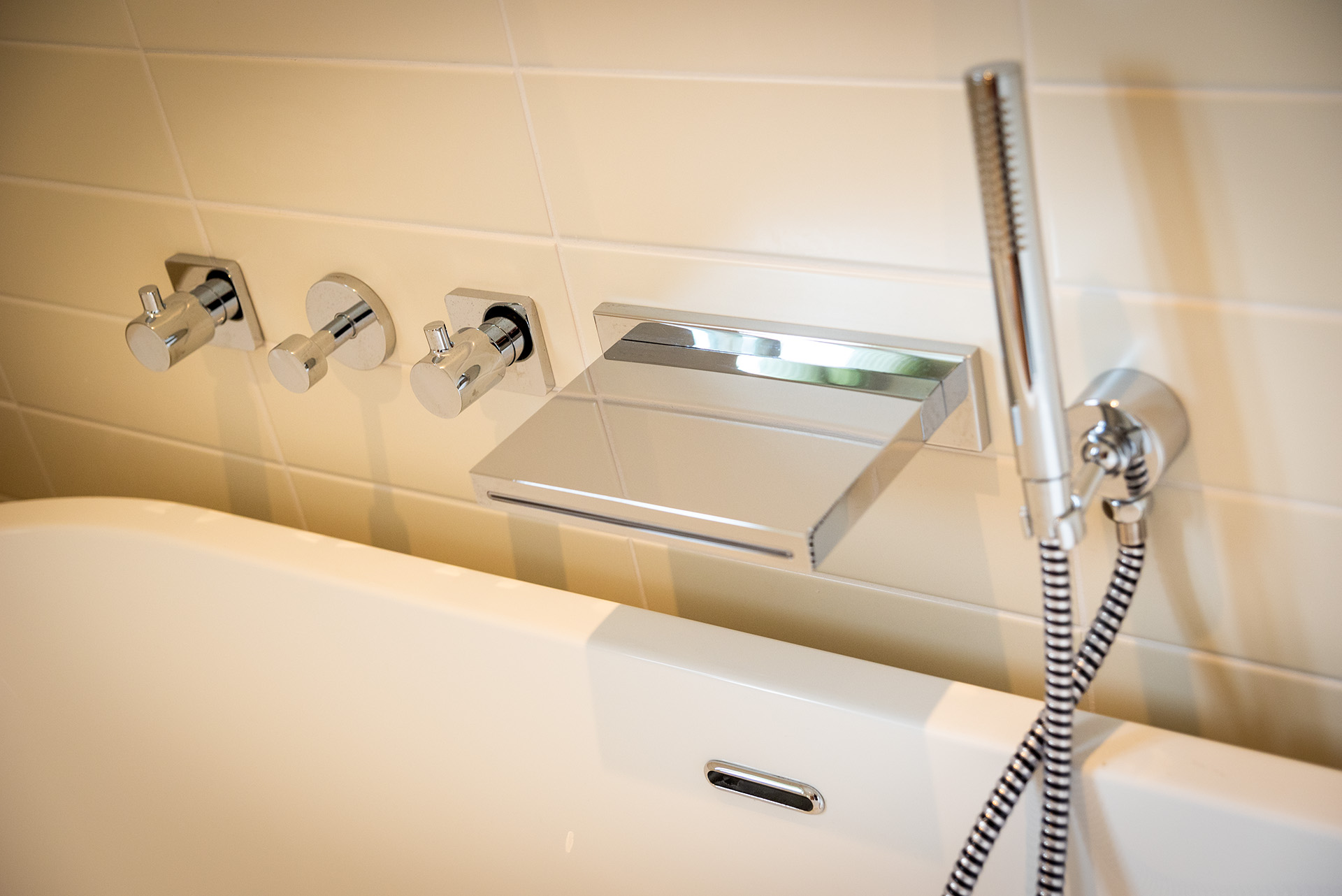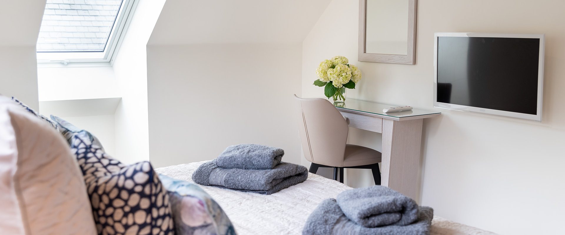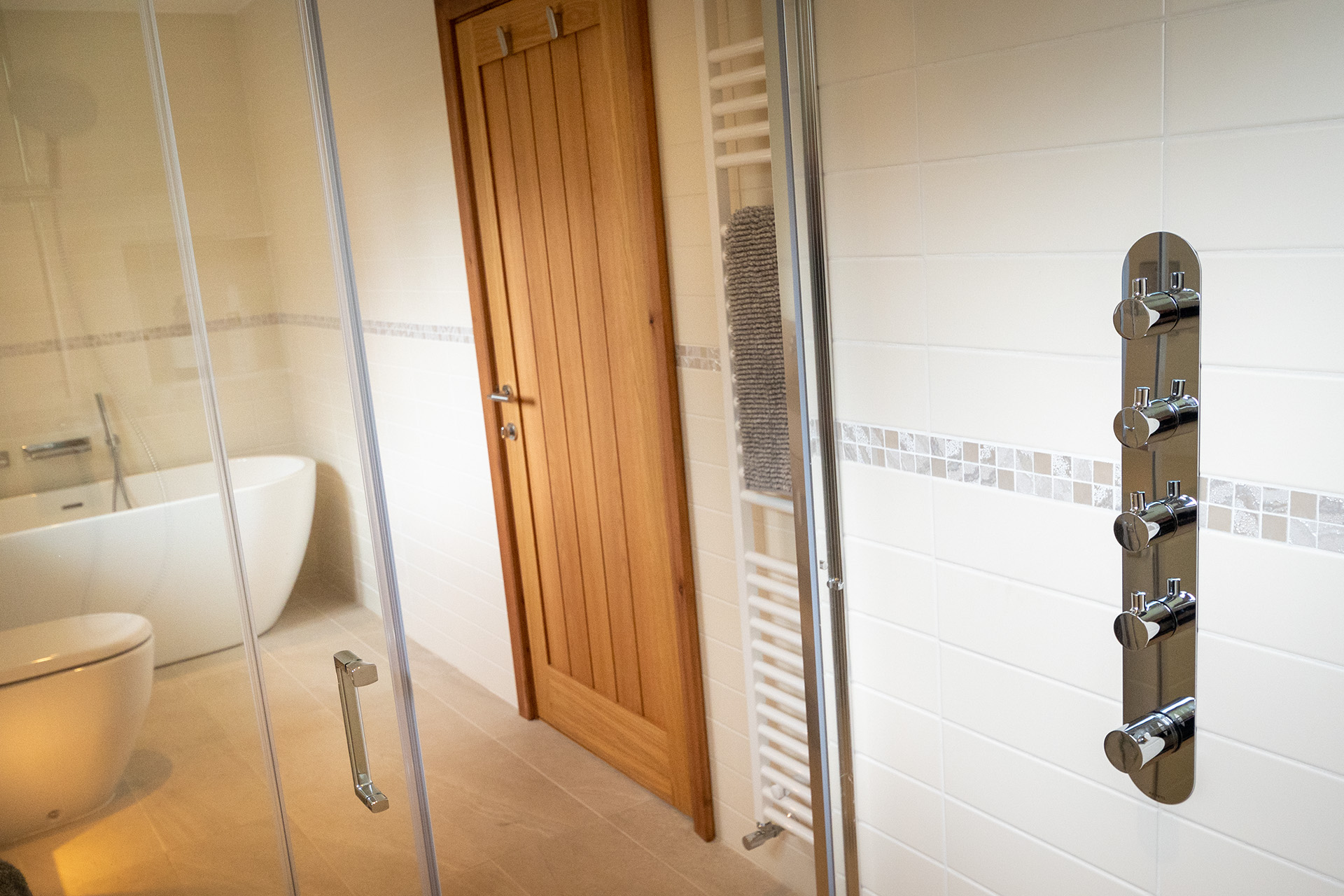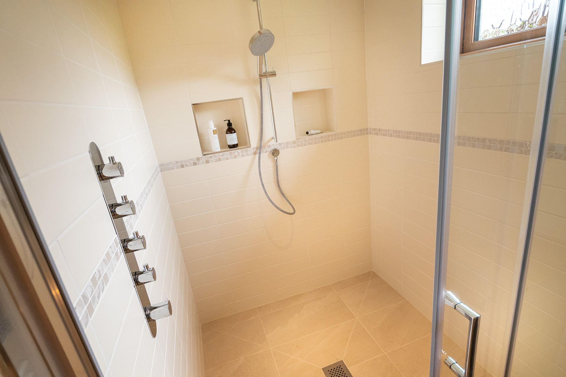 There are two spacious bedroom suites, one on each floor. Both of these have super-king beds, dressing area and en-suite bathrooms with huge walk-in rain showers. The ground floor bedroom has a superb spa-style shower area for the ultimate shower experience as well as a free-standing bath. Each bedroom has a wall mounted Smart TV.
