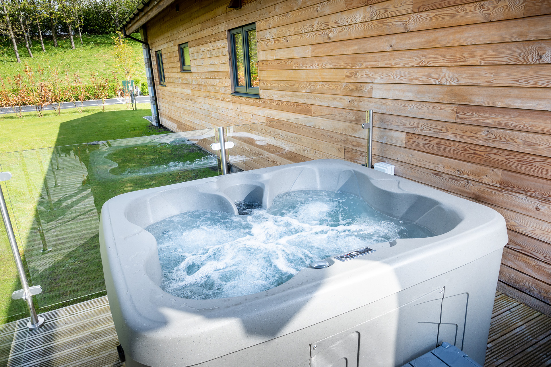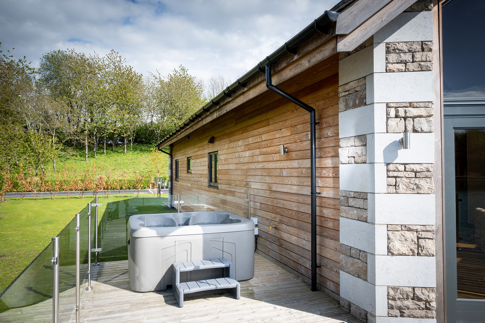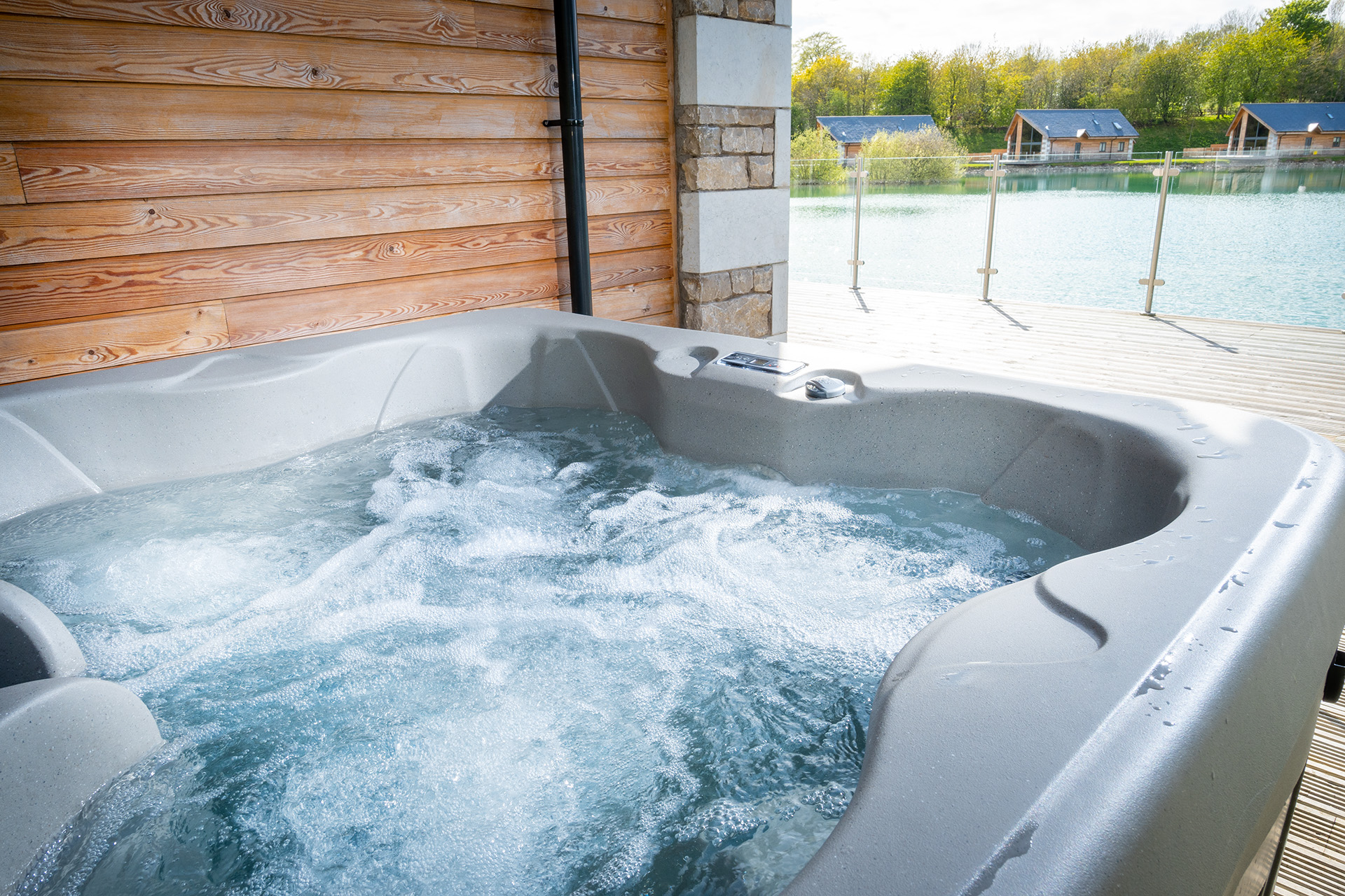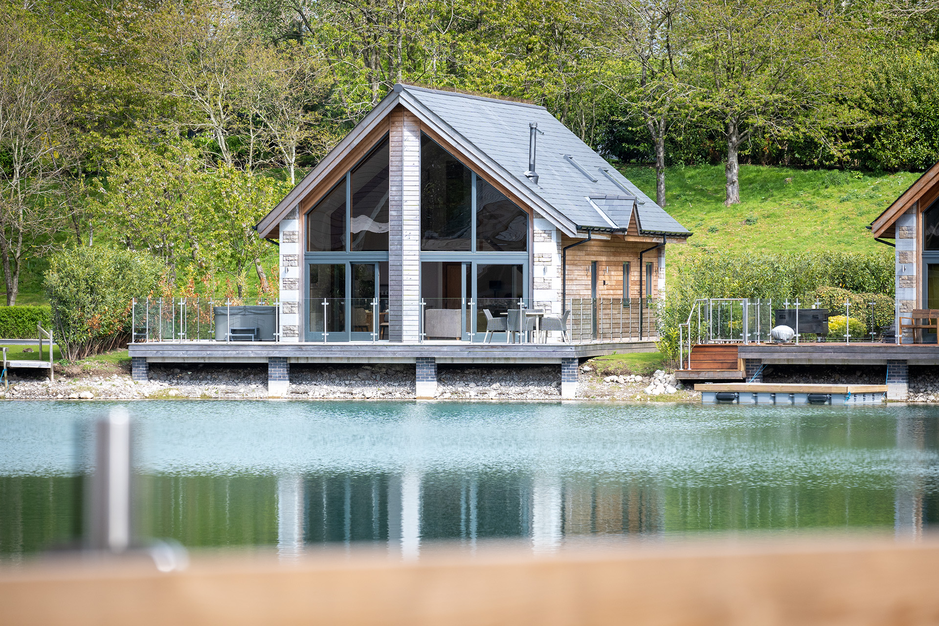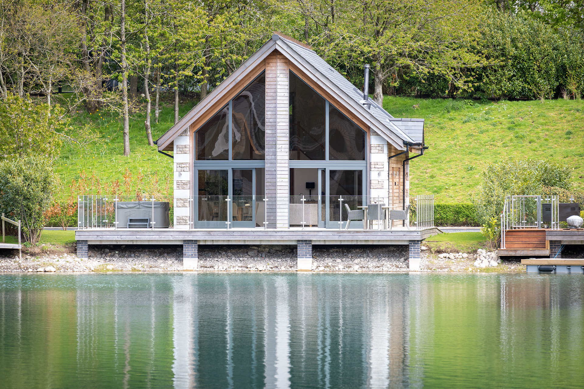 The decking area wraps around the property and features outdoor dining furniture for al fresco dining. From here you can sit and watch the lake dwellers, an abundance of birds, ducks and a variety of fish (which you are free to catch if you can)! The hot tub is perfectly positioned on the deck to take in the lake view after a dayโ€™s walking or exploring.