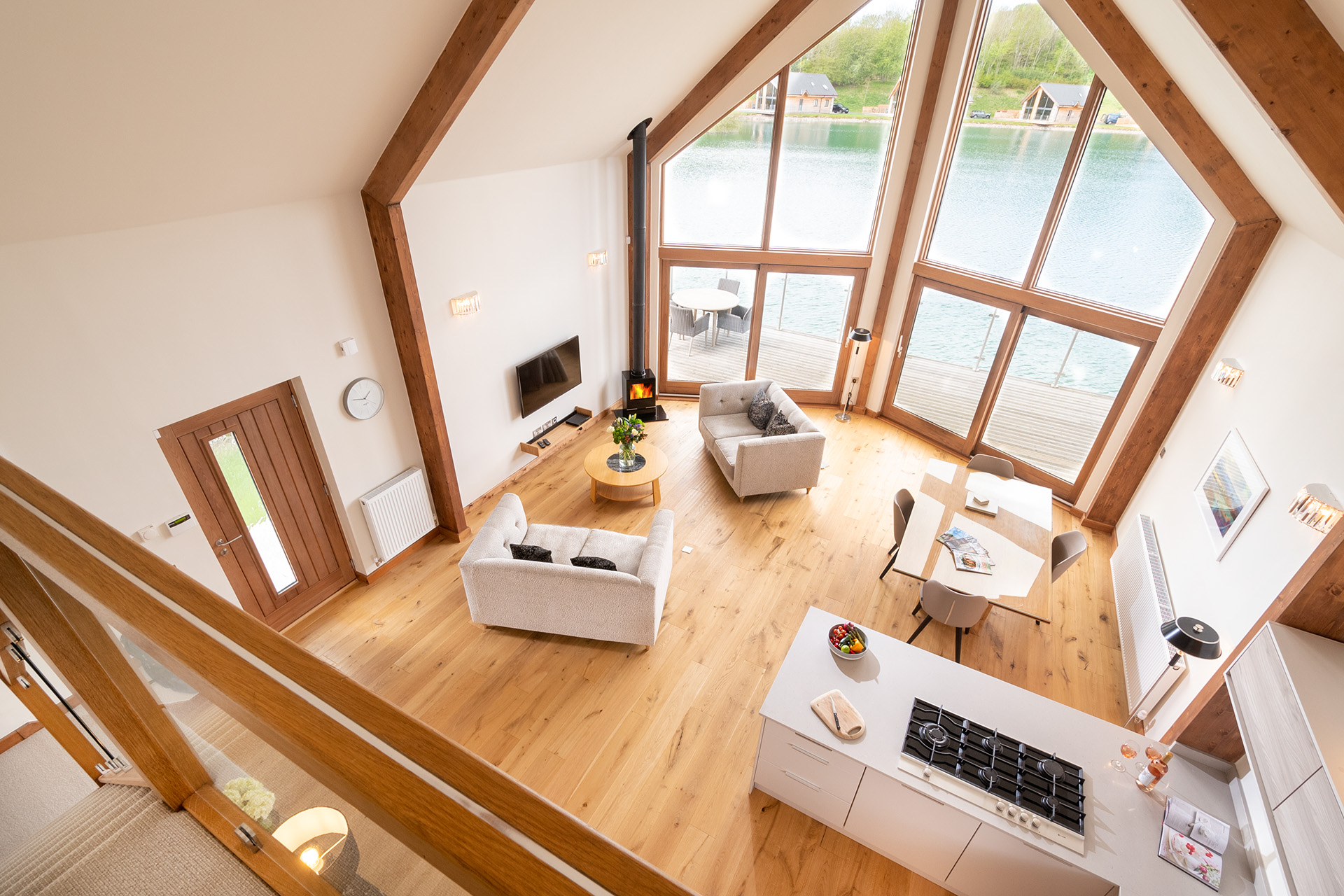 There is a super-efficient log effect stove which gives the property a cosy atmosphere and whilst you will be mesmerised by the lake in front of you, there is also a Smart TV and hyper-fast broadband.