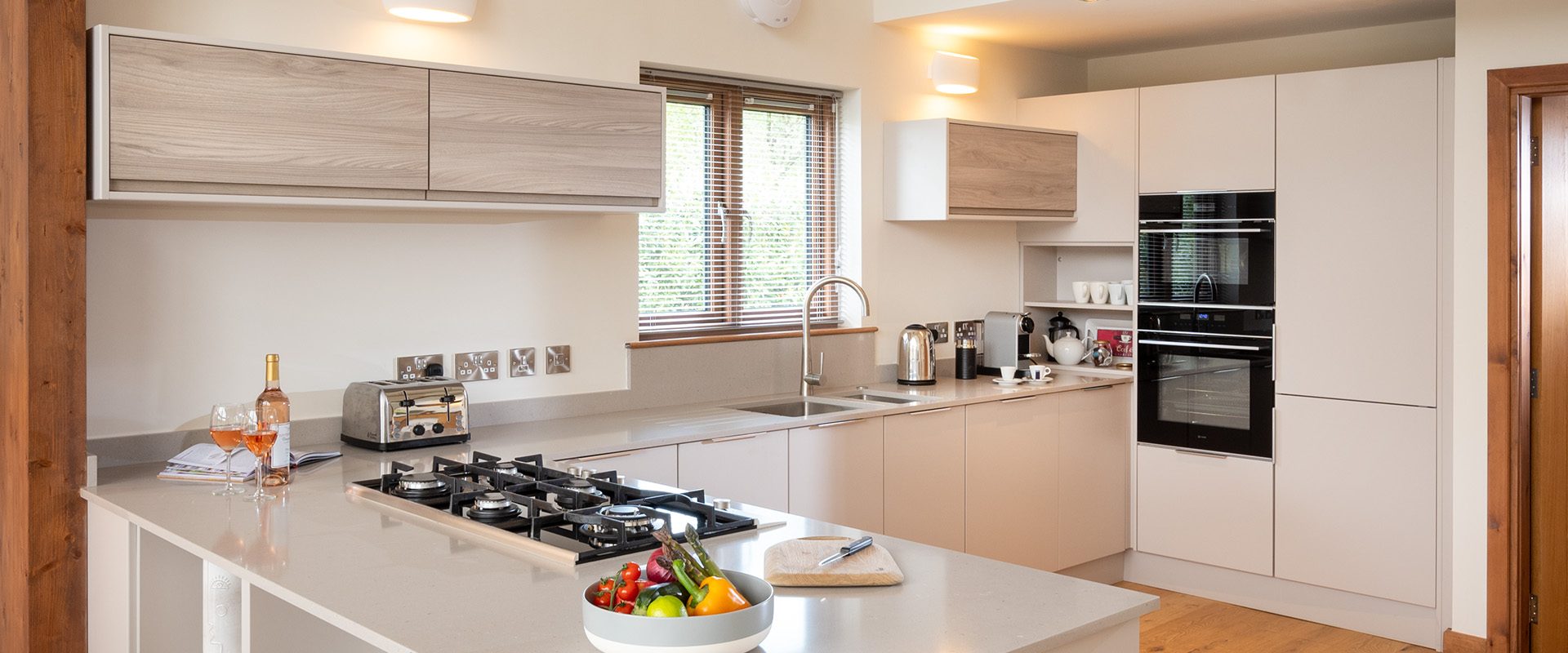 The open kitchen area is fully fitted with all modern appliances, fridge-freezer, oven, 5 ring gas hob, wine chiller, dishwasher and Nespresso machine. Adjacent to the kitchen area there is ample storage for coats, boots/shoes and a gorgeous ground floor guest cloakroom.