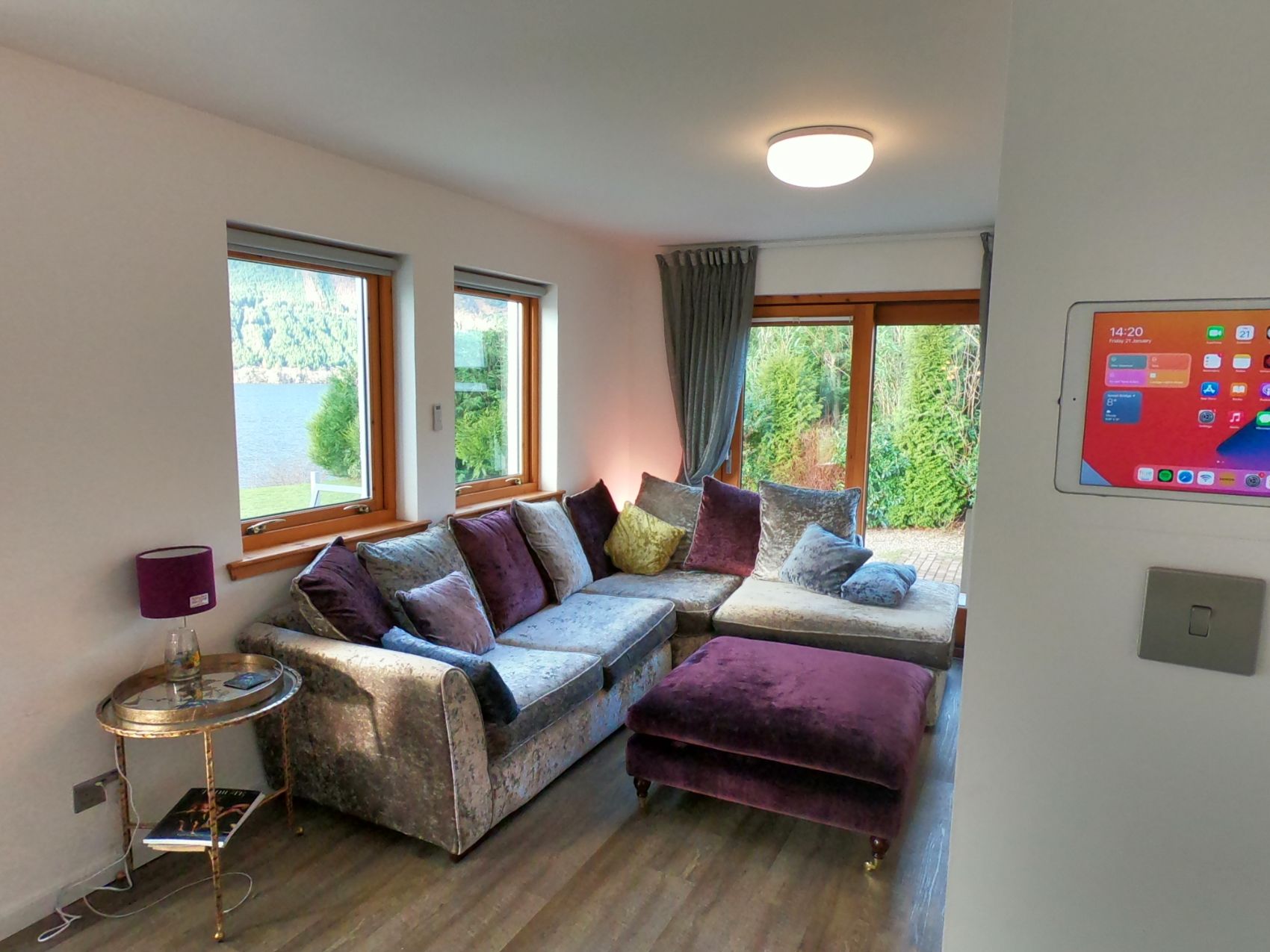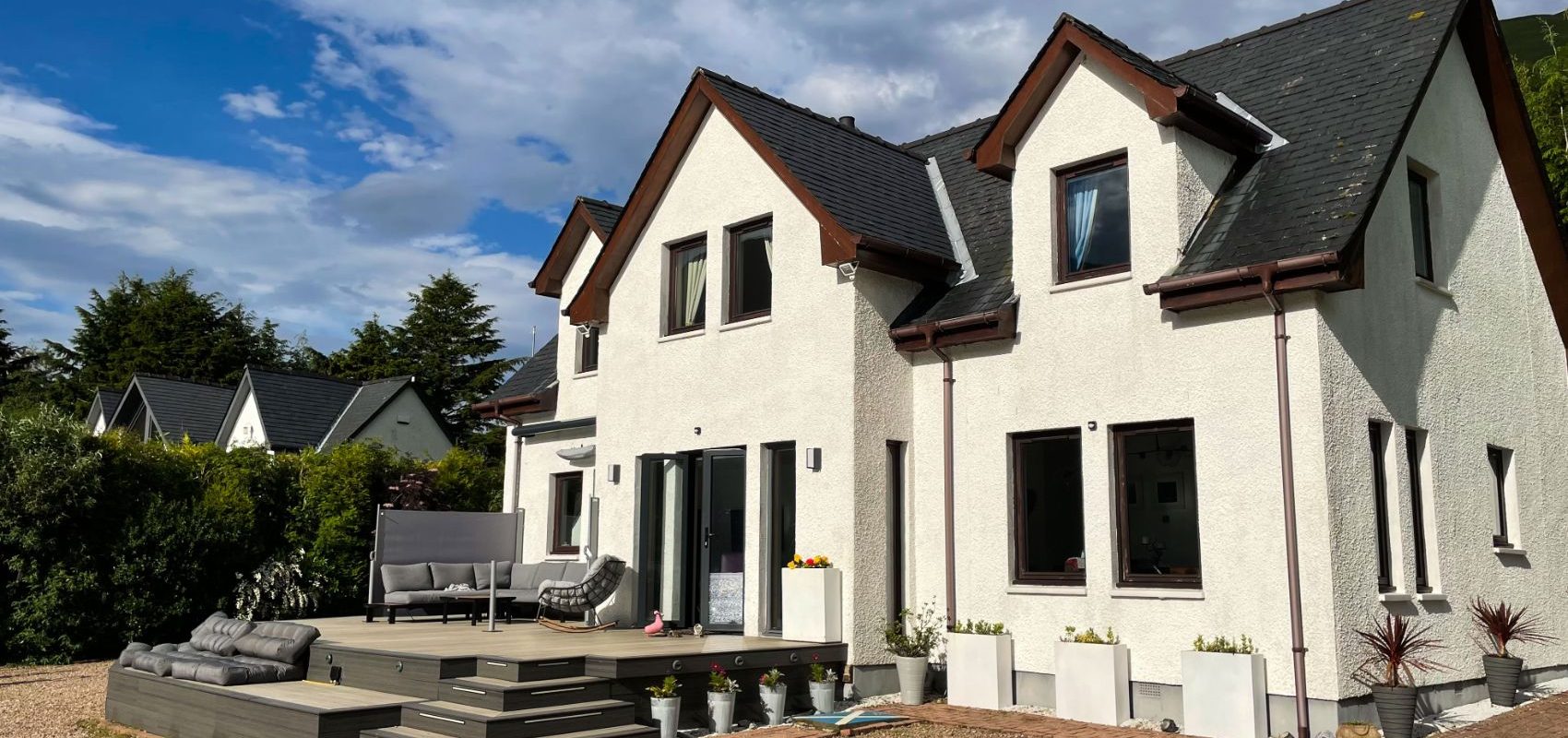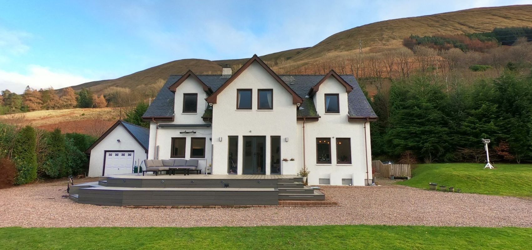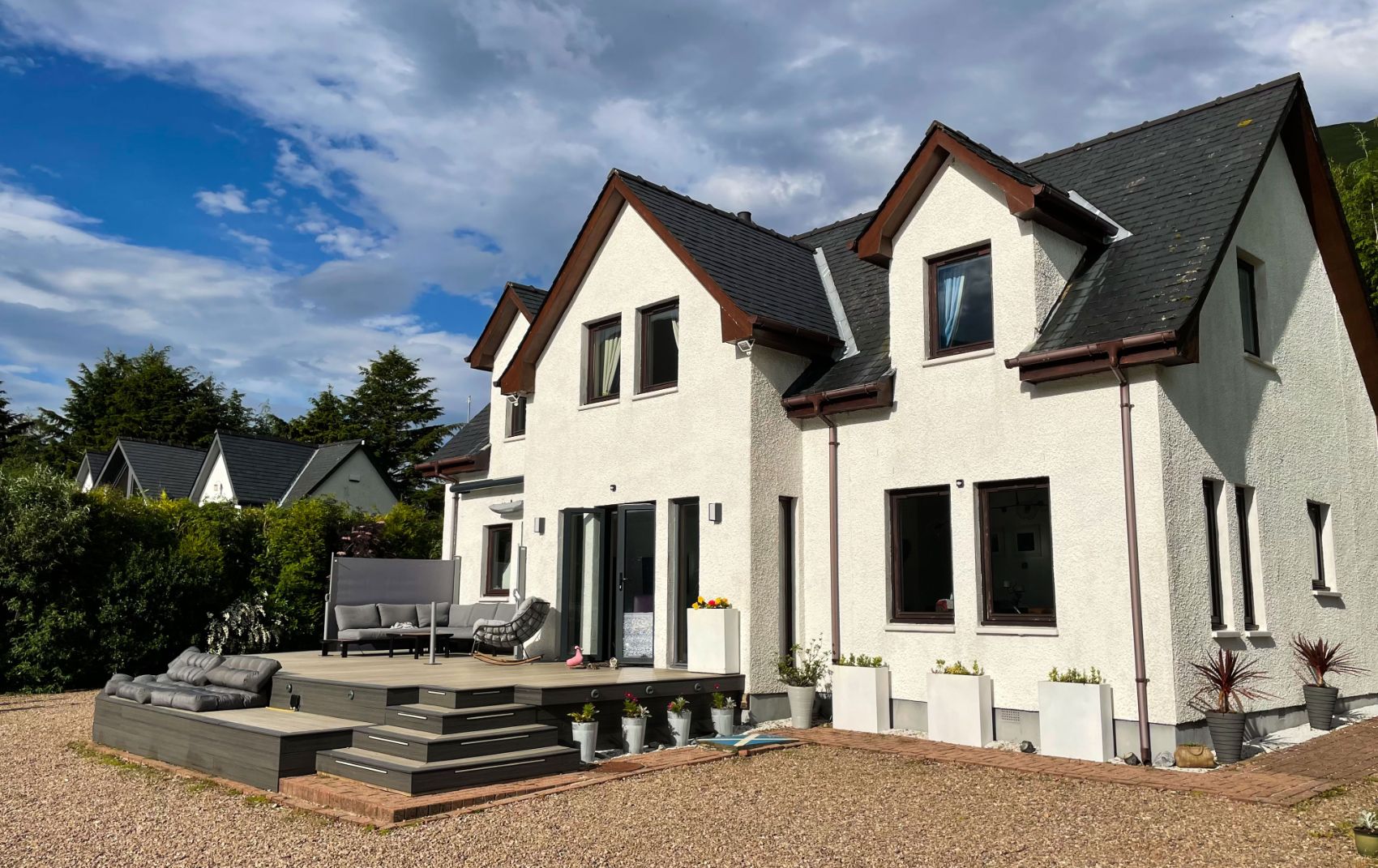 The house has three spacious double bedrooms all with en suite bathrooms. All bedrooms are located on the first floor each with stunning views over the Loch. Bed linen, towels and complimentary highland hand soaps are provided as part of the package. On the ground floor, the large newly fitted and fully equipped kitchen with luxury appliances leads onto the open plan lounge and dining area. The kitchen, lounge and dining area all boast stunning Loch and mountain views. In addition, there is an office space ideal for home working and a separate toilet with a washbasin. There is a large decking area at the front of the house with an outside corner sofa and an electric awning with an infrared heater.