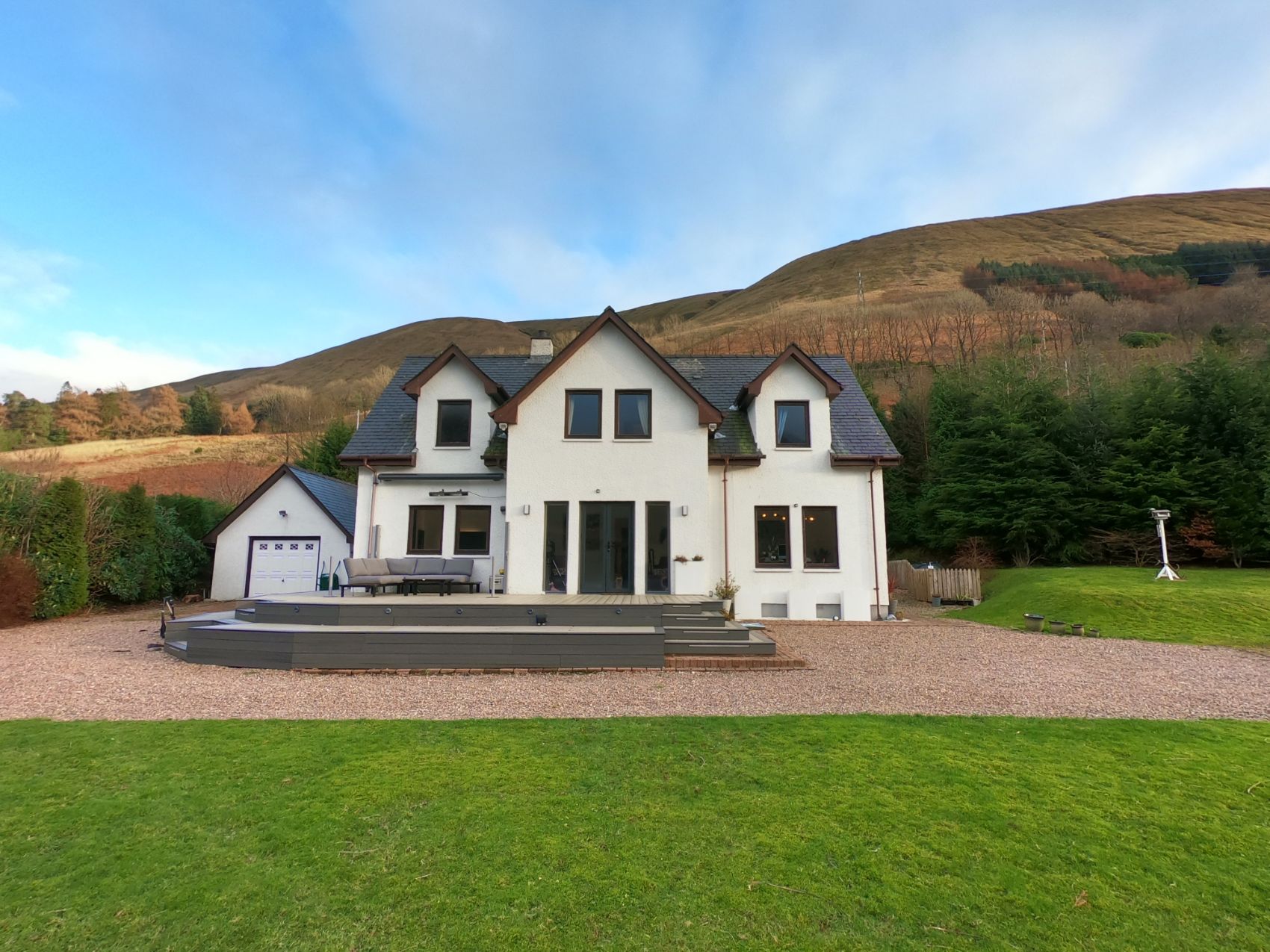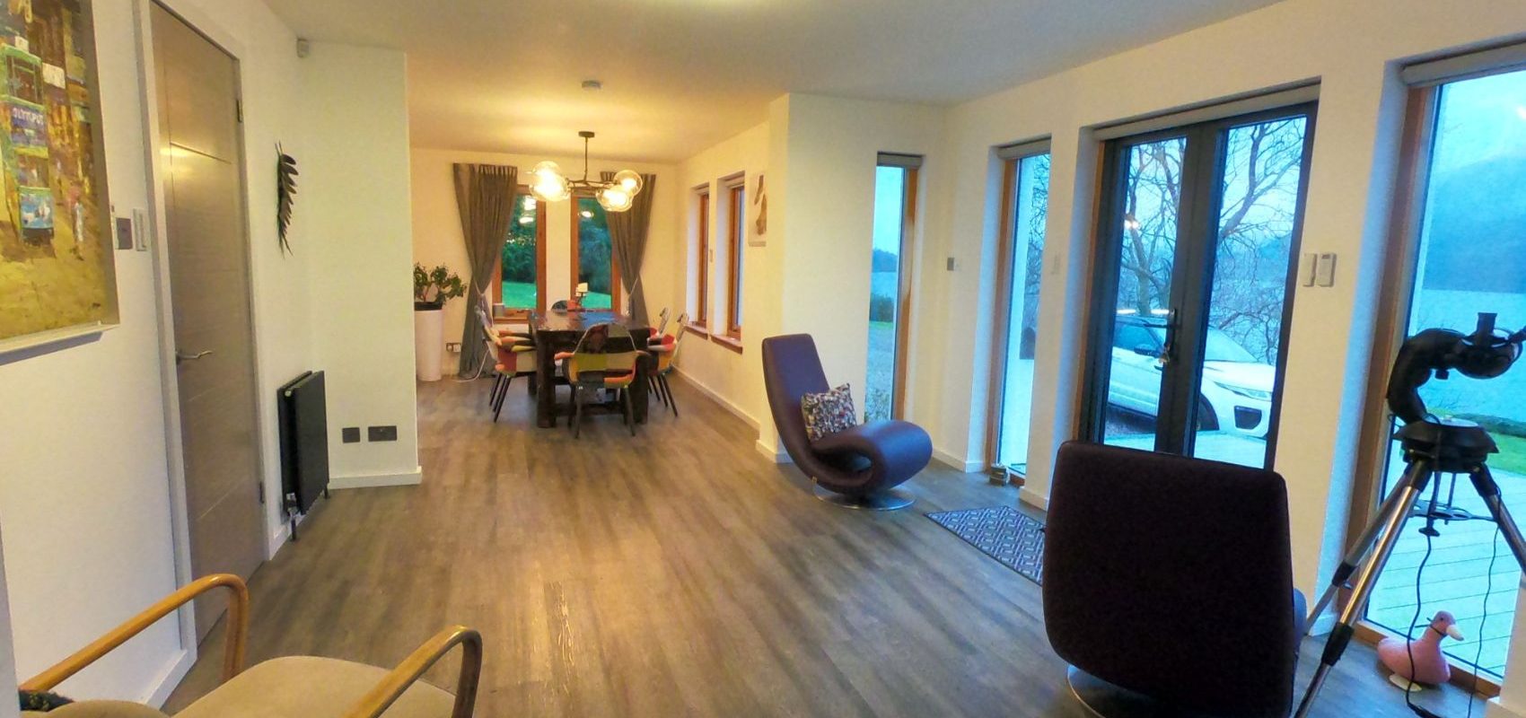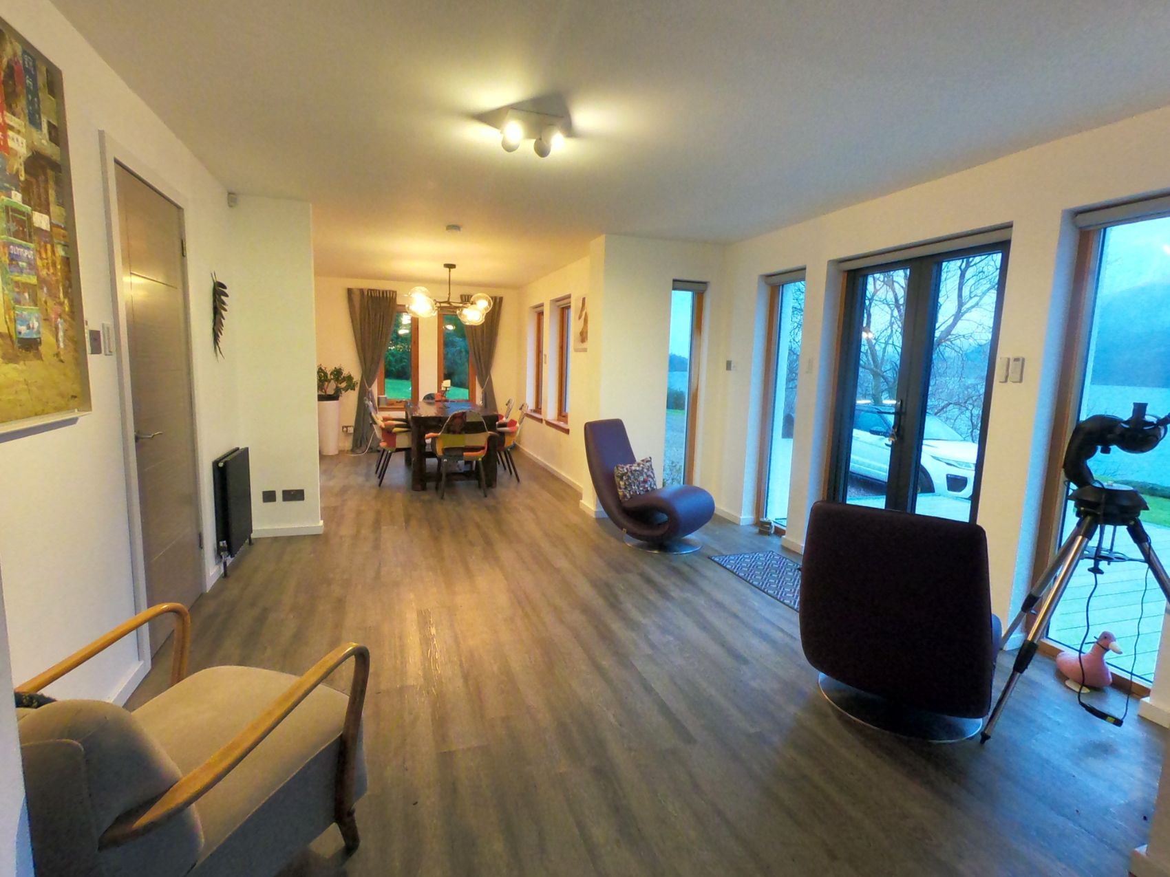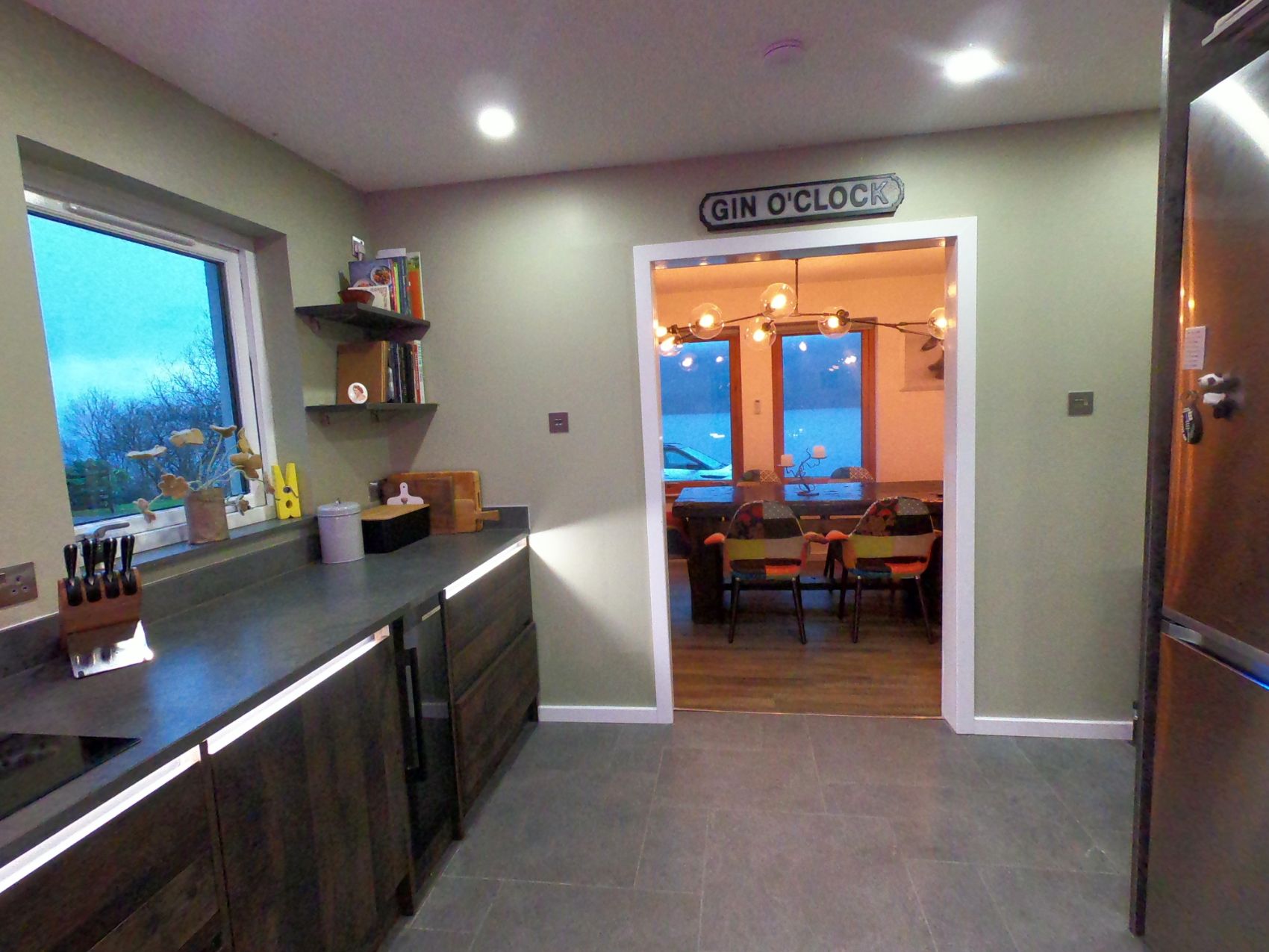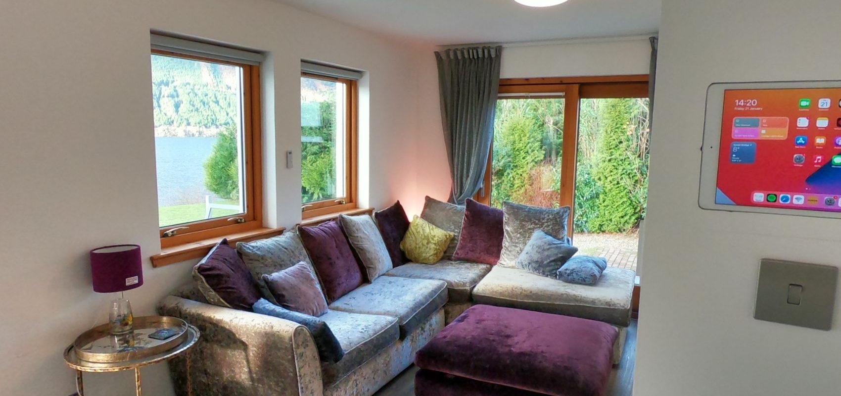 The house has three spacious double bedrooms all with en suite bathrooms. All bedrooms are located on the first floor each with stunning views over the Loch. Bed linen, towels and complimentary highland hand soaps are provided as part of the package. On the ground floor, the large newly fitted and fully equipped kitchen with luxury appliances leads onto the open plan lounge and dining area. The kitchen, lounge and dining area all boast stunning Loch and mountain views. In addition, there is an office space ideal for home working and a separate toilet with a washbasin. There is a large decking area at the front of the house with an outside corner sofa and an electric awning with an infrared heater.