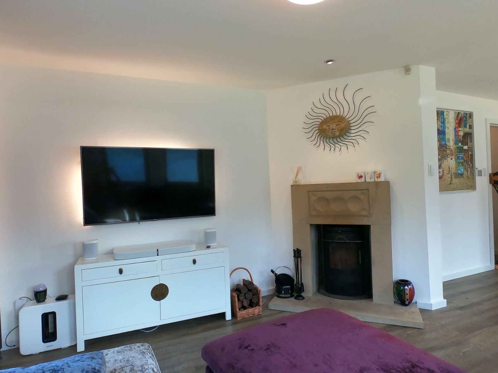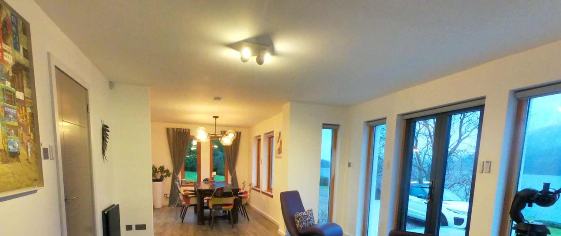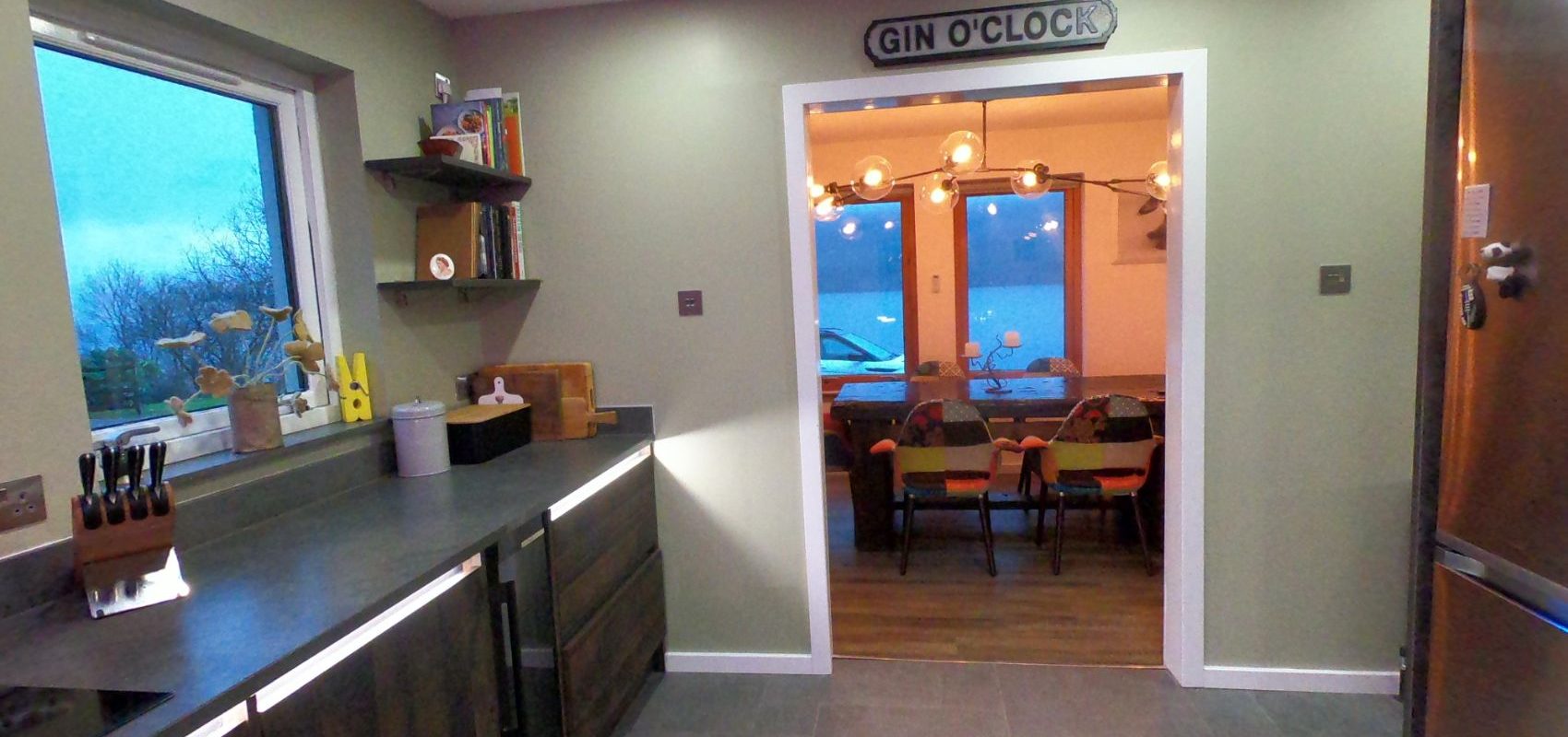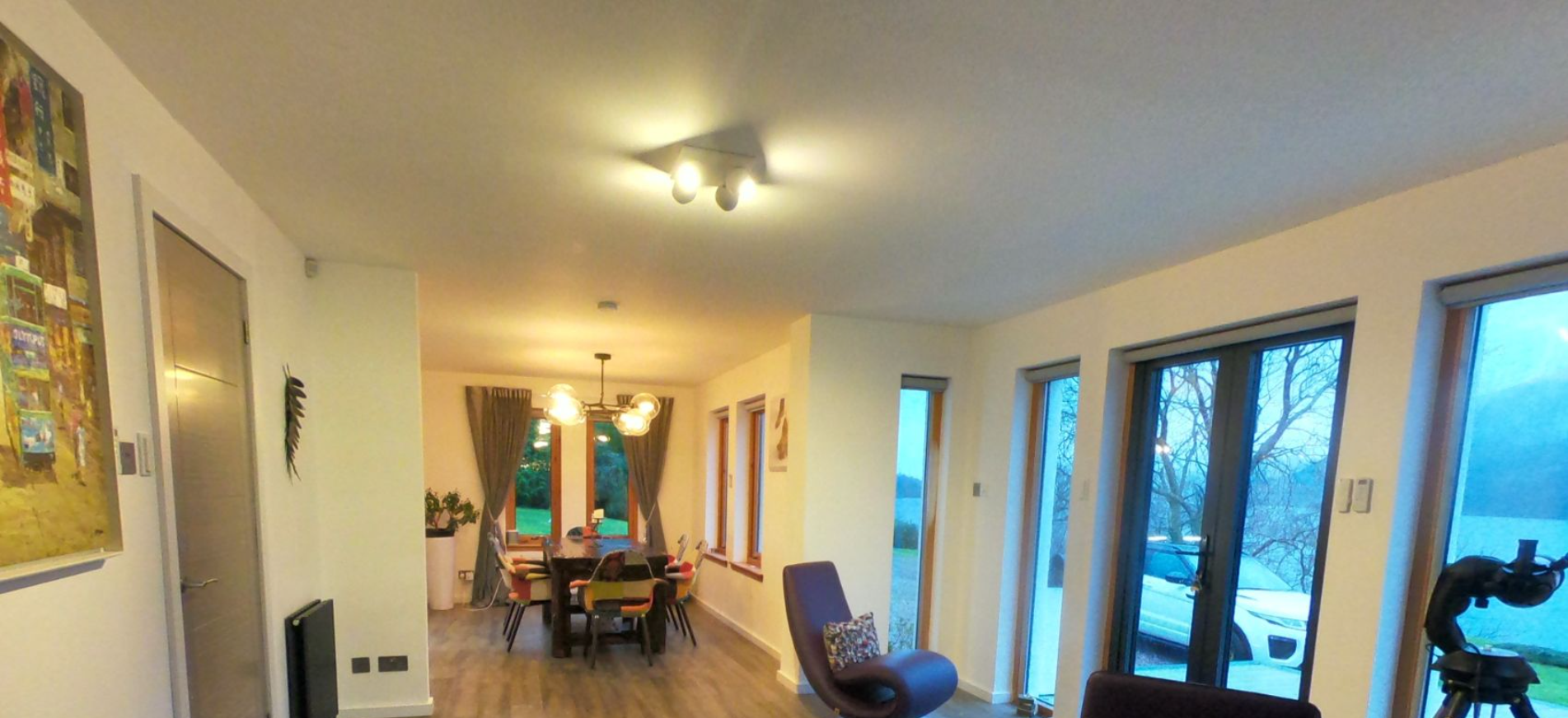 The house has three spacious double bedrooms all with en suite bathrooms. All bedrooms are located on the first floor each with stunning views over the Loch. Bed linen, towels and complimentary highland hand soaps are provided as part of the package. On the ground floor, the large newly fitted and fully equipped kitchen with luxury appliances leads onto the open plan lounge and dining area. The kitchen, lounge and dining area all boast stunning Loch and mountain views. In addition, there is an office space ideal for home working and a separate toilet with a washbasin. There is a large decking area at the front of the house with an outside corner sofa and an electric awning with an infrared heater.