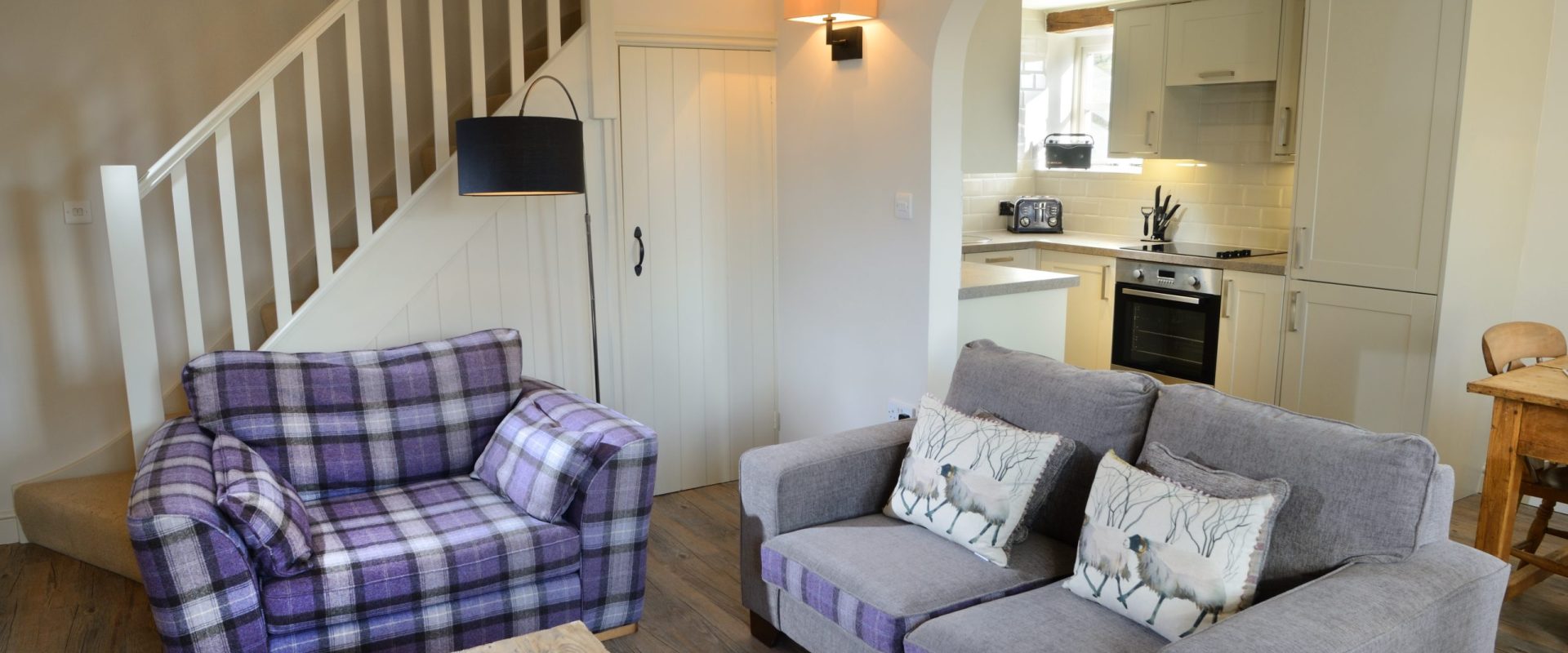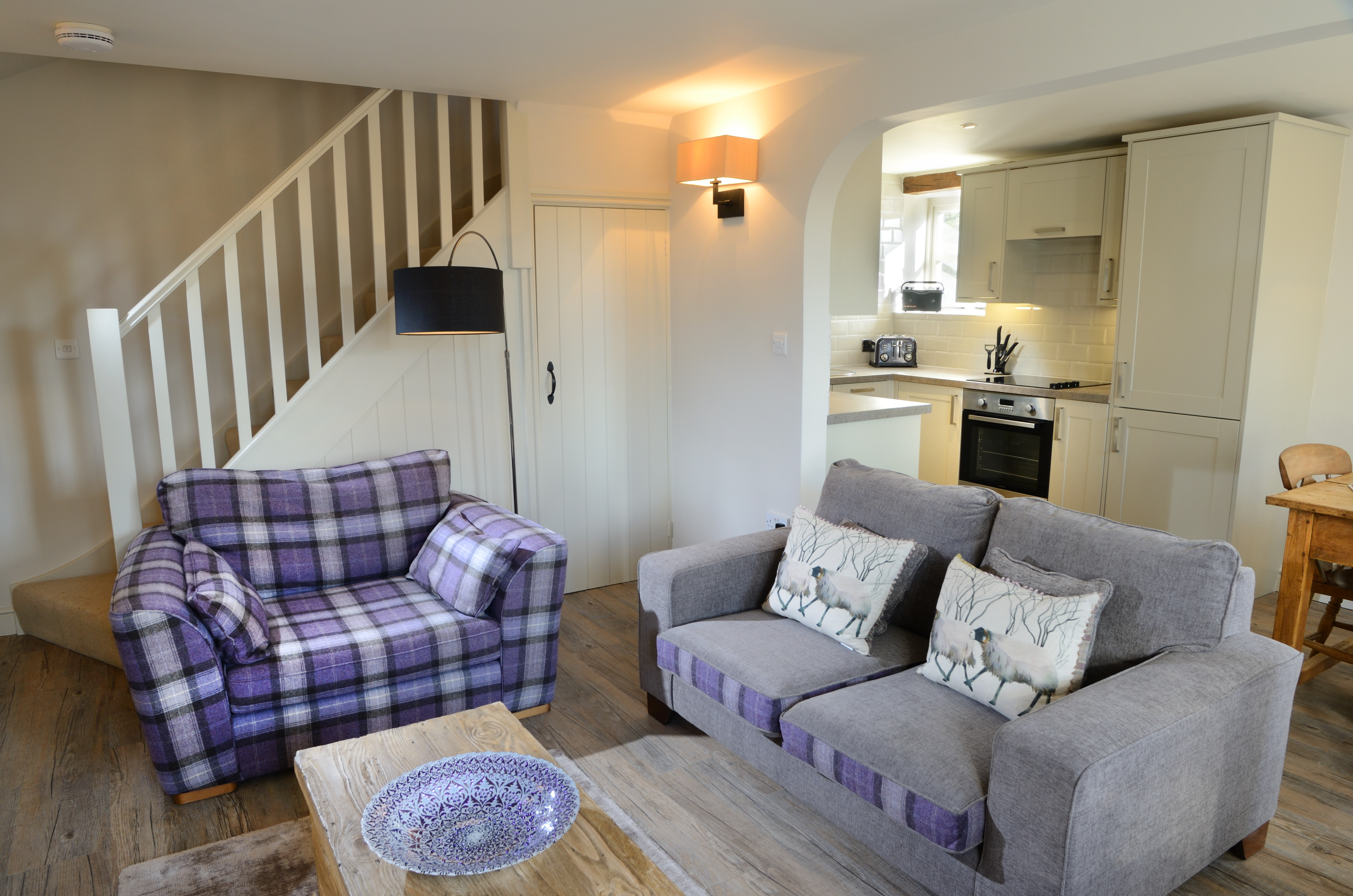 The ground floor boasts an open plan living space with kitchen/diner & lounge. The fully equipped kitchen has modern appliances, including an electric hob and oven, microwave, dishwasher and a fridge-freezer. The sitting room has an authentic wood-burning stove, comfortable armchairs and a sofa, as well as a TV, DVD and CD player, DAB radio and wi-fi access.