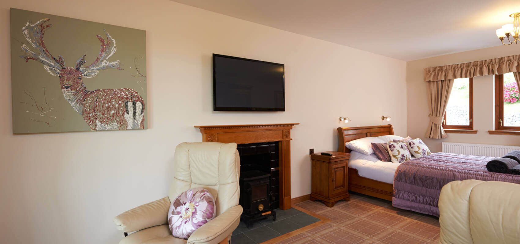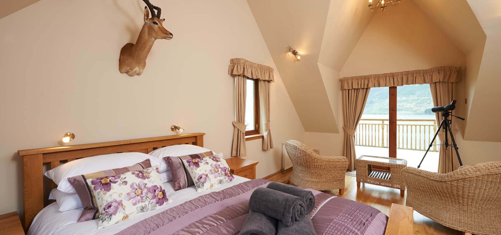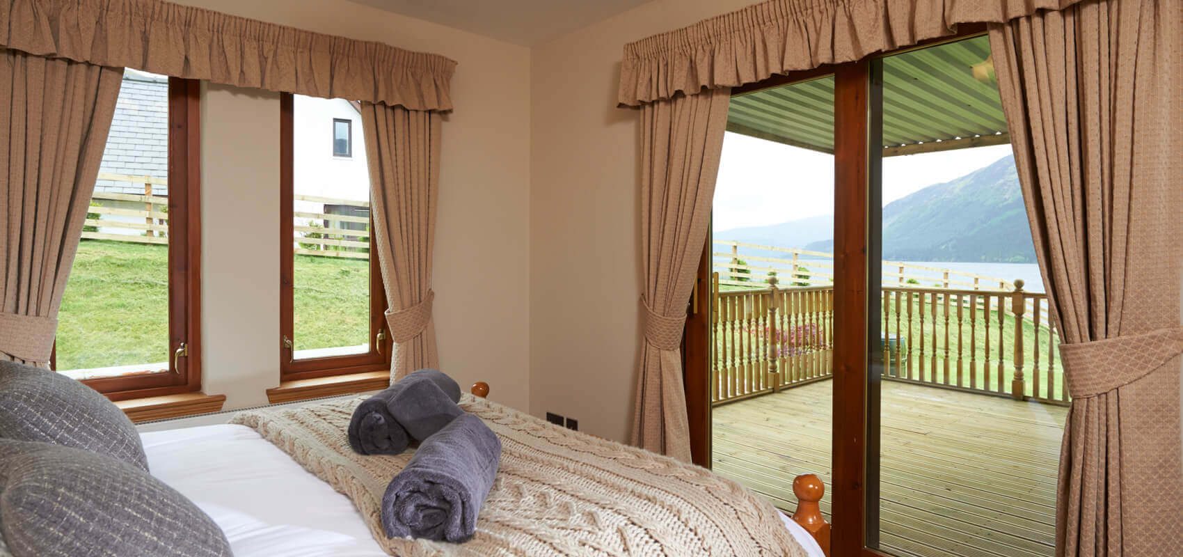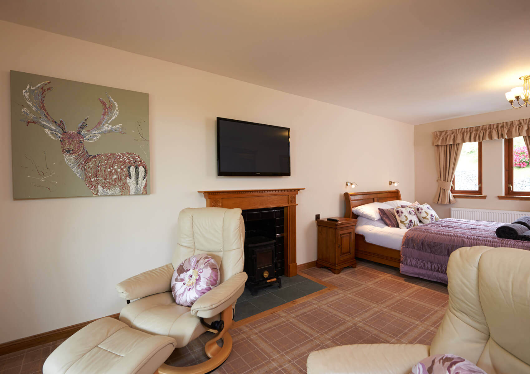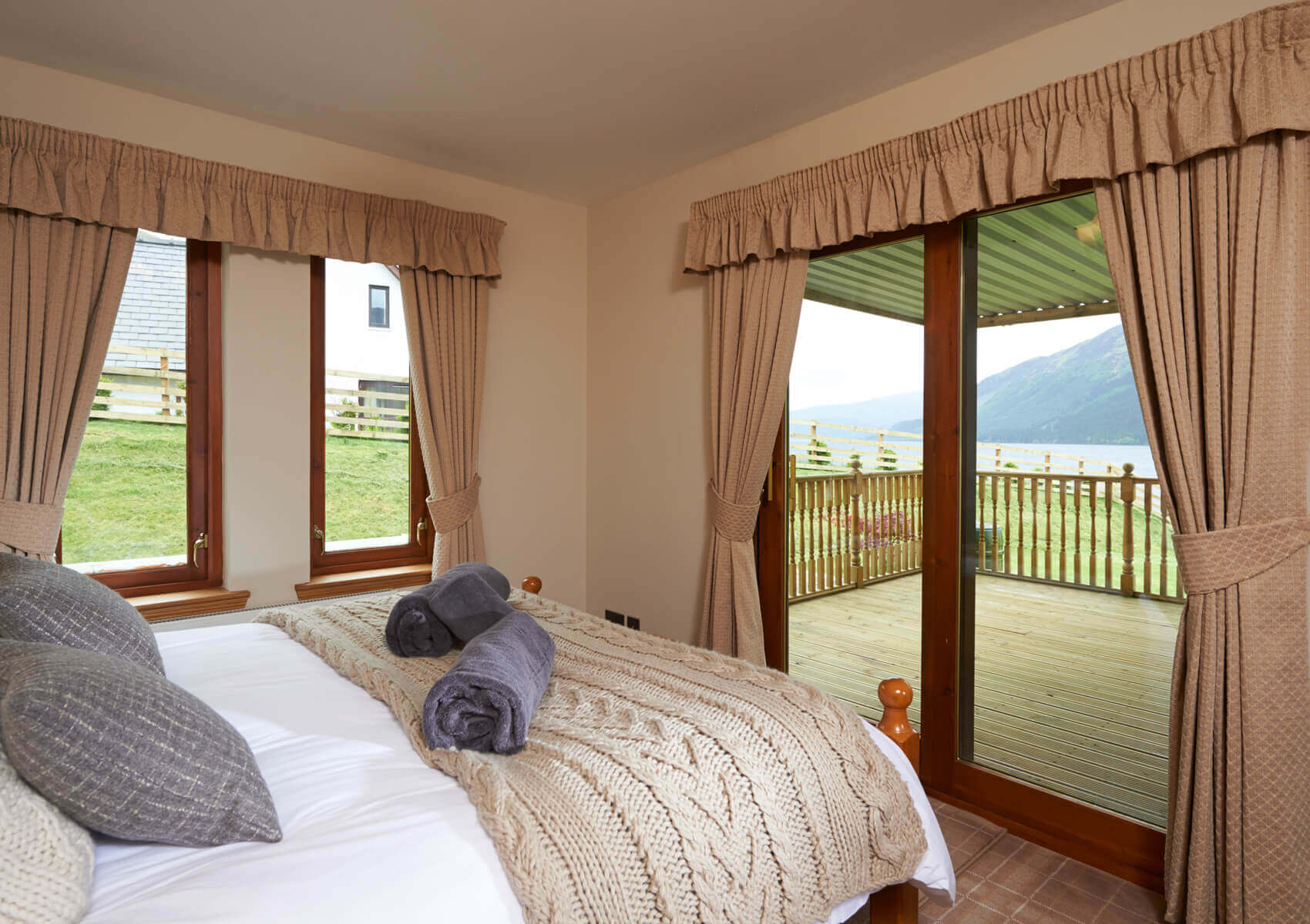 Each bedroom has french windows leading out onto a decking area overlooking the loch. The two principal bedroom suites have 32 inch televisions and one has a wood burning stove. Each of these two main bedrooms have seating and relaxing areas from which to enjoy the loch views and watch the boats going up and down the loch.