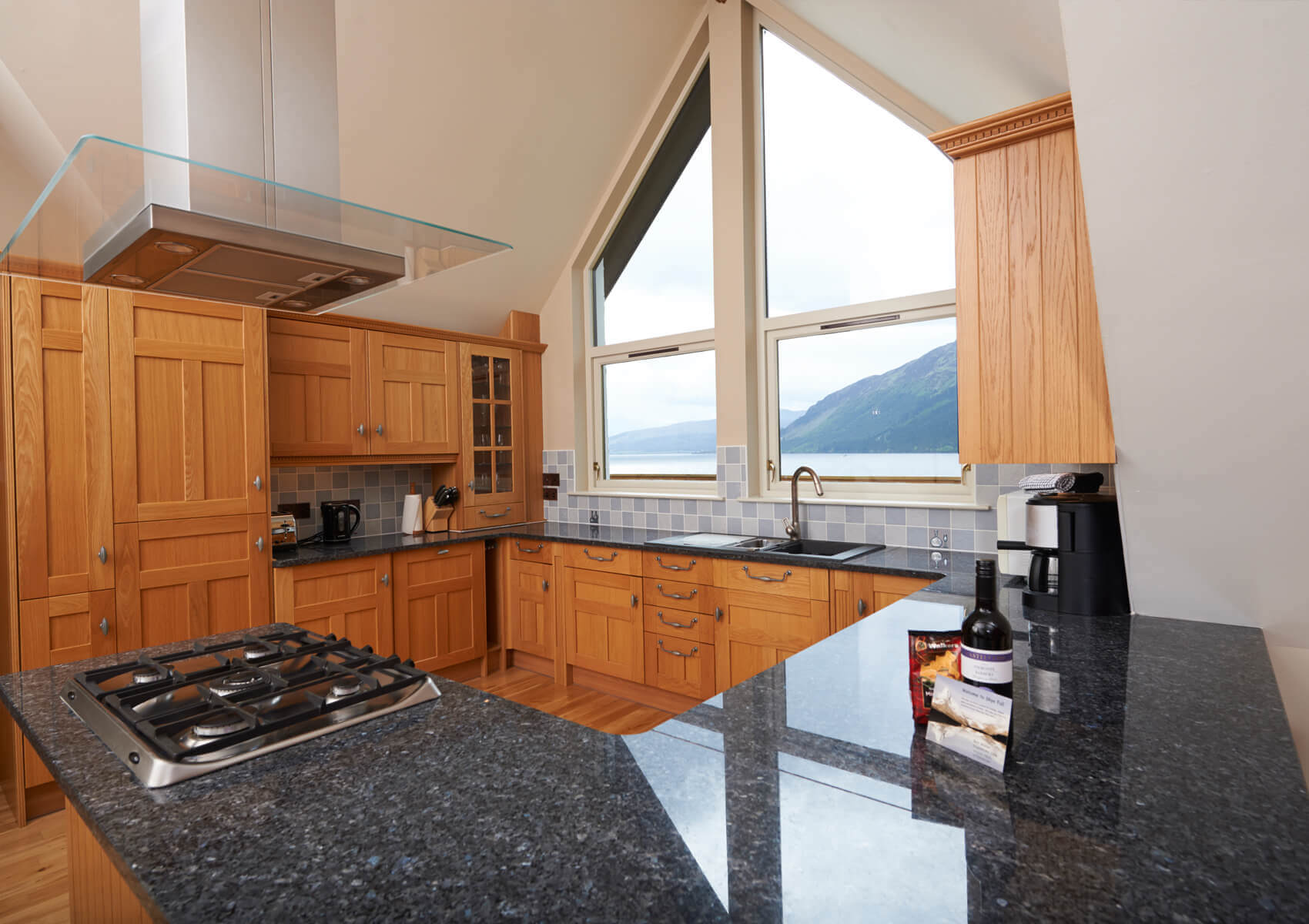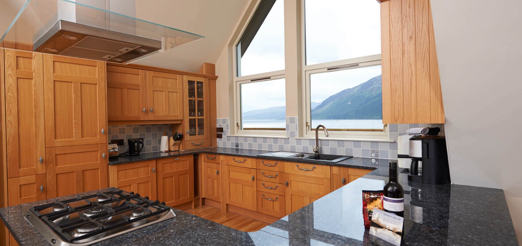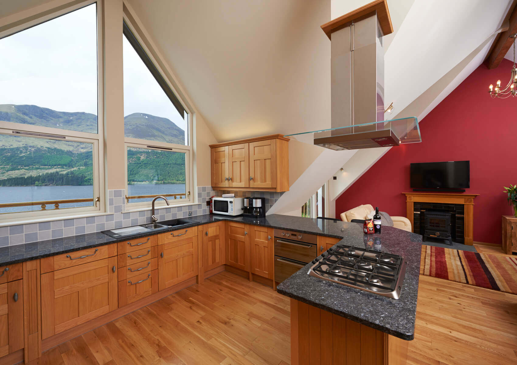 The open plan sitting room and kitchen area are located on the first floor with dramatic views of the loch. The large wall mounted TV in the sitting room has a sound bar and sub woofer system for enhanced volume . There is a DVD player and DVD library also. The sitting room also has a wood burning stove.