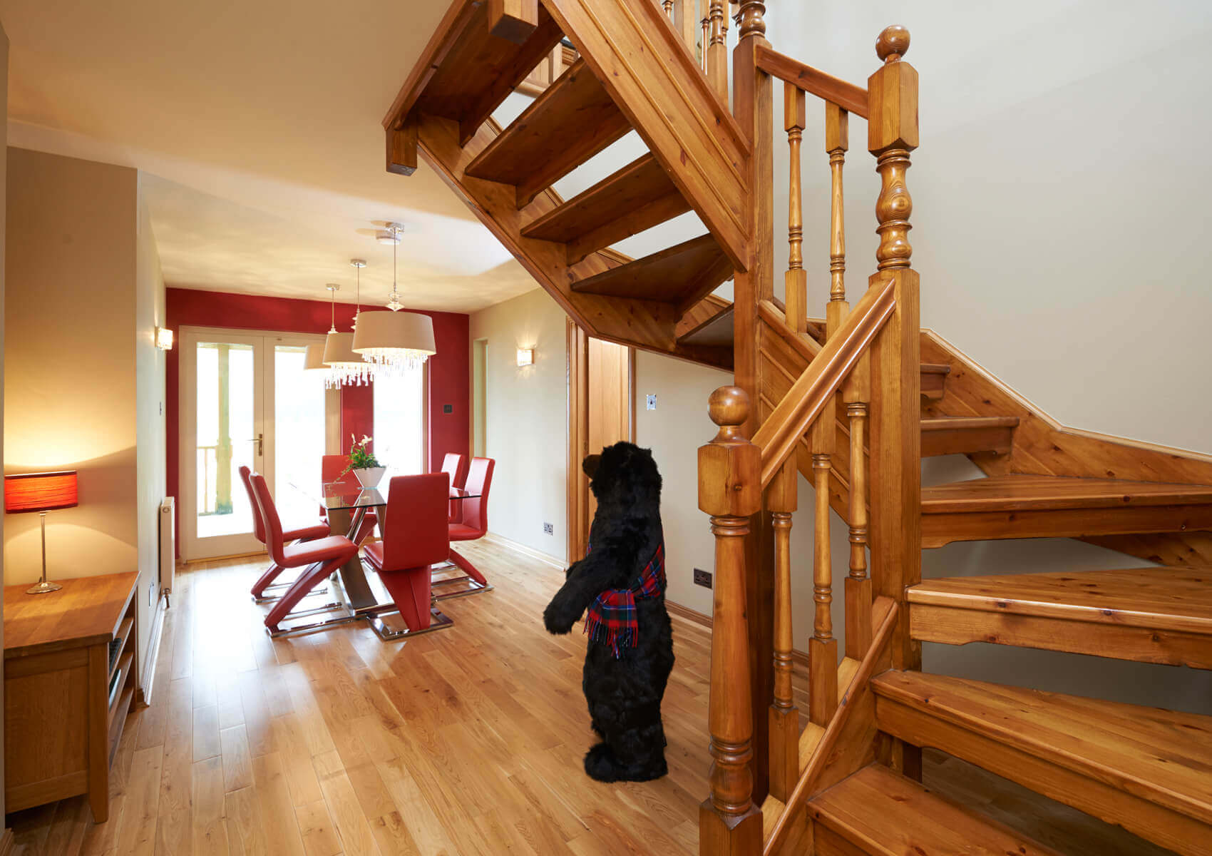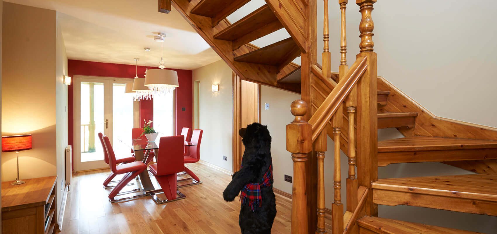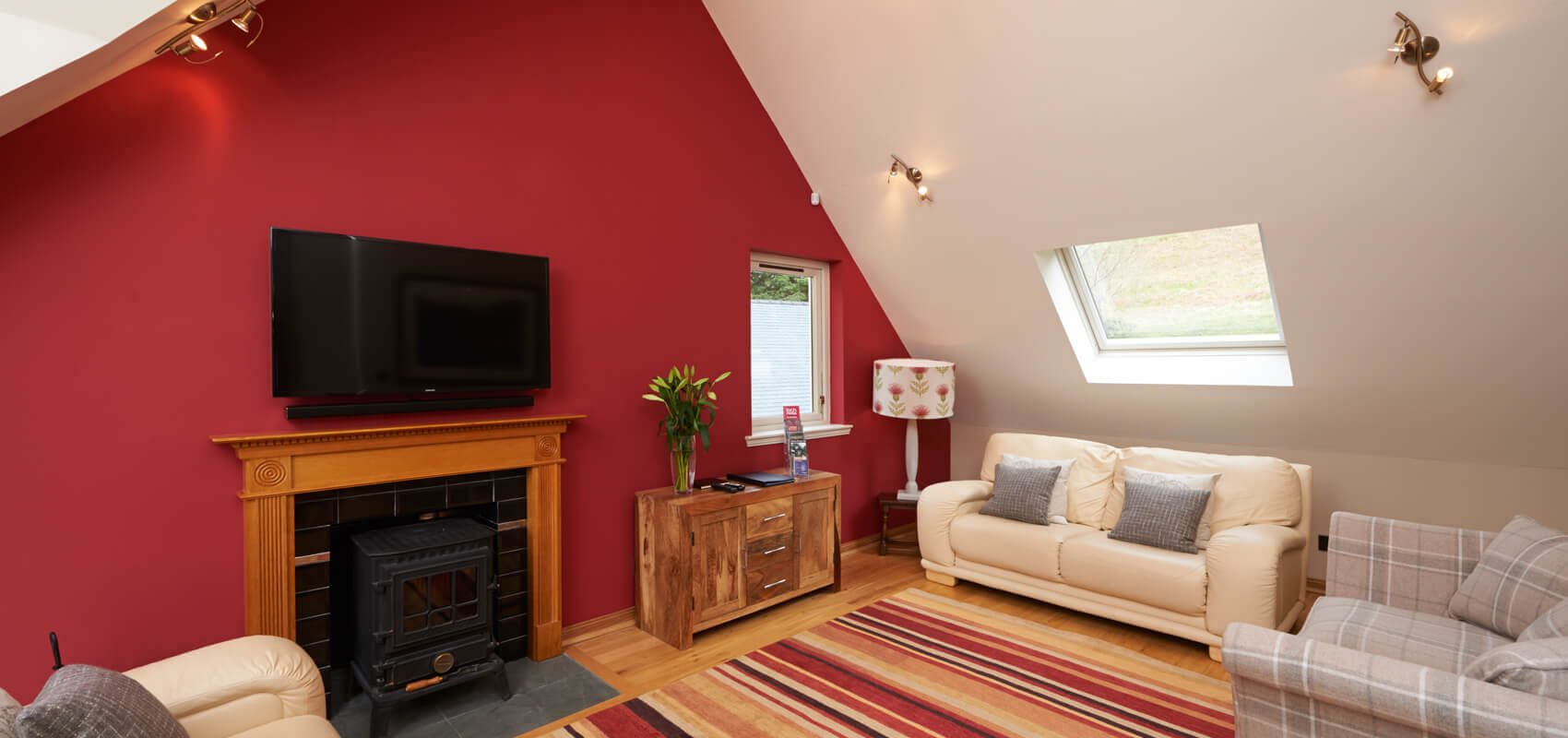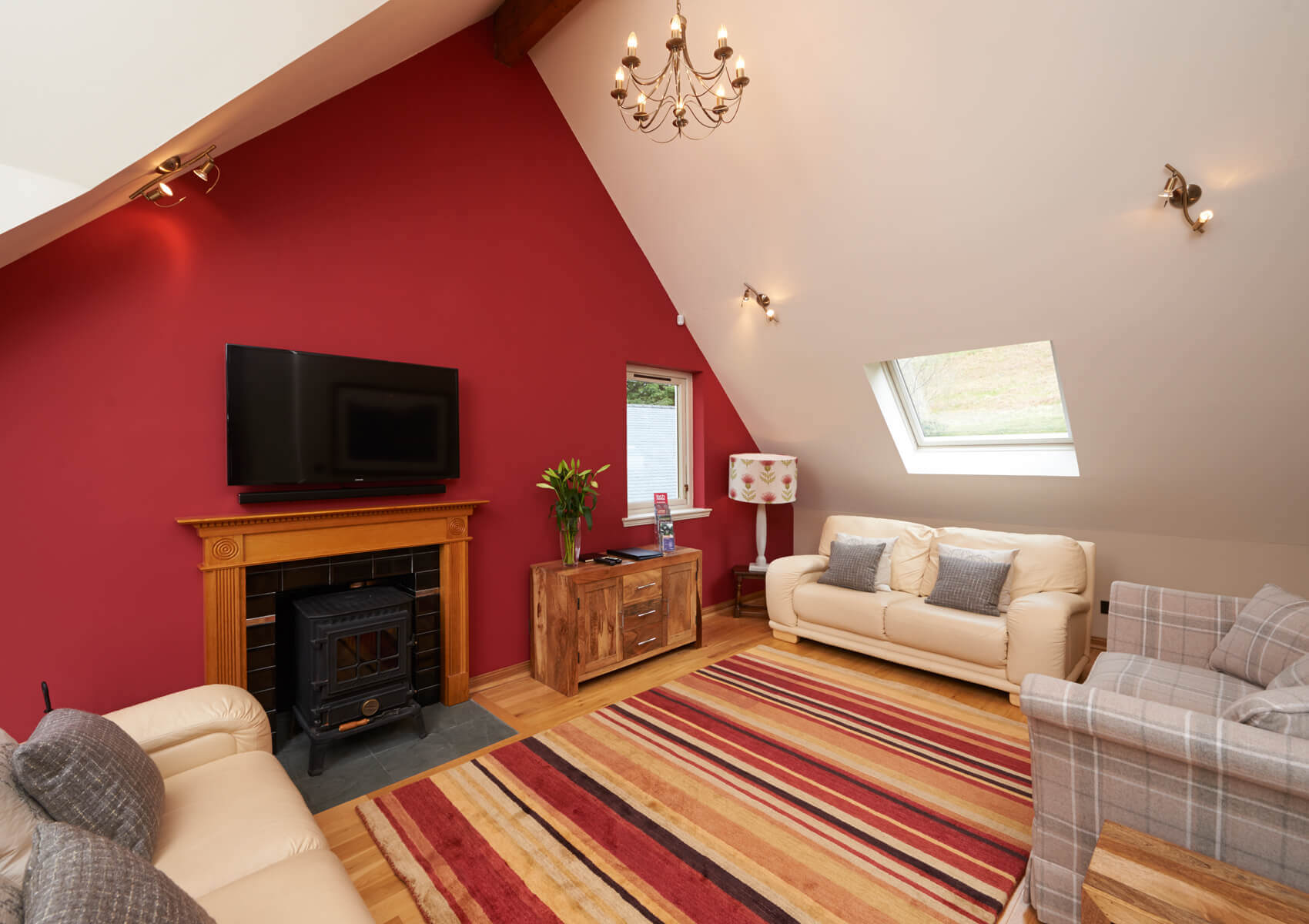 The open plan sitting room and kitchen area are located on the first floor with dramatic views of the loch. The large wall mounted TV in the sitting room has a sound bar and sub woofer system for enhanced volume . There is a DVD player and DVD library also. The sitting room also has a wood burning stove.