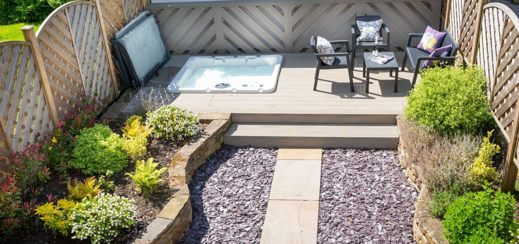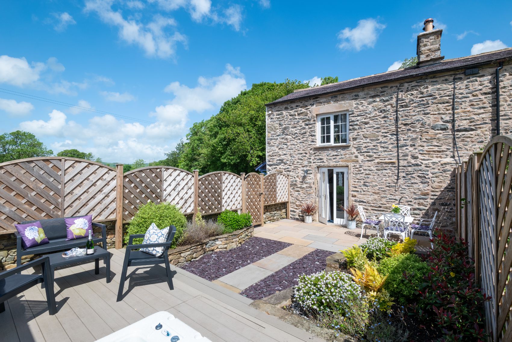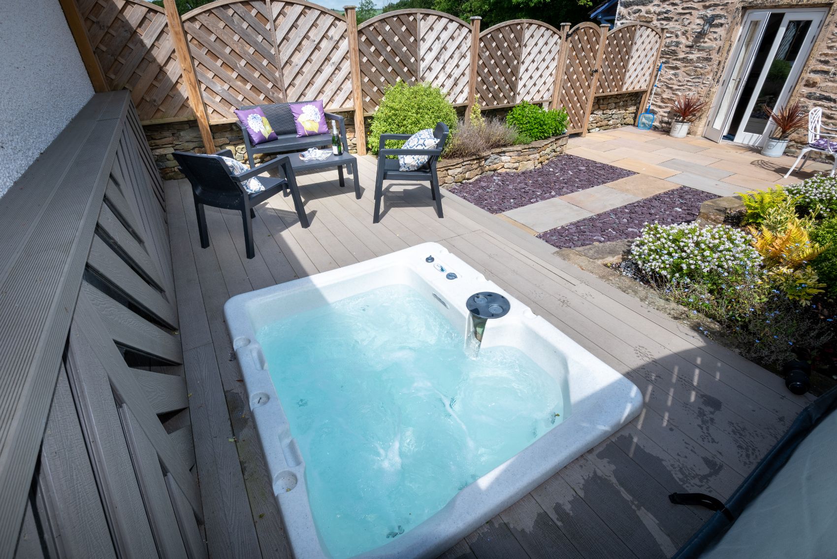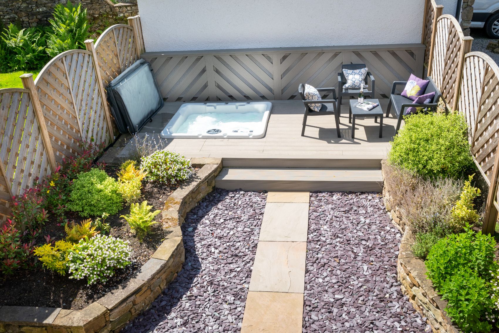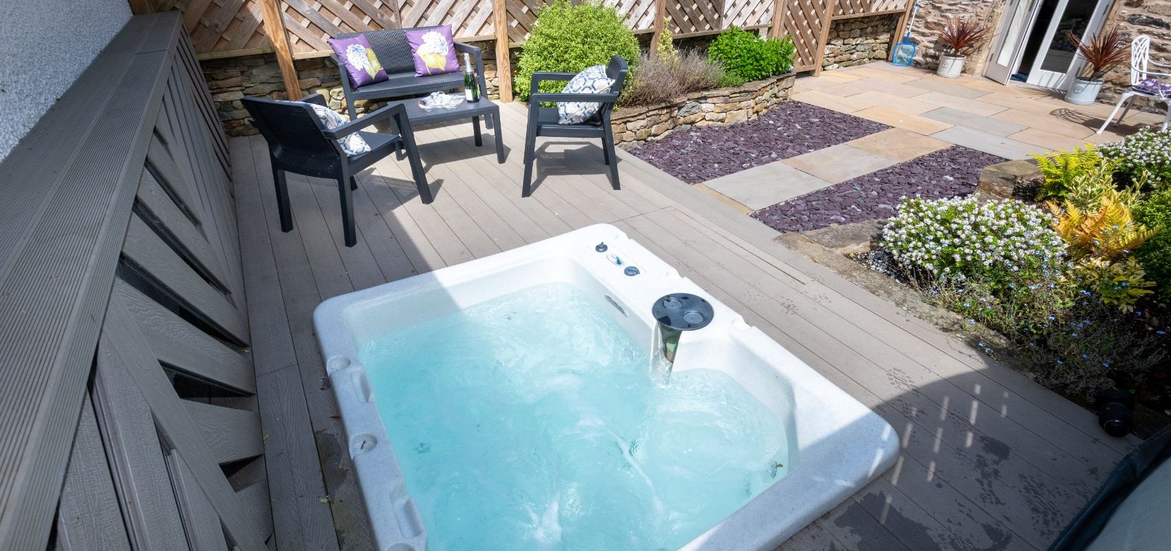 Opening up the patio doors you are met with a private garden, plenty of seating to enjoy throughout the day and a hot tub on the decking area.