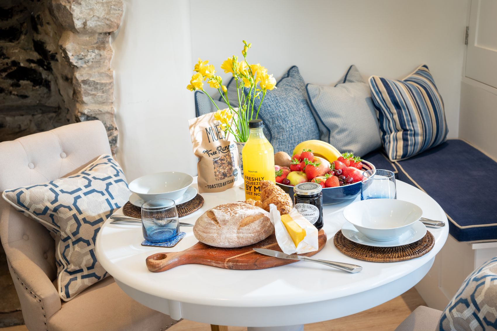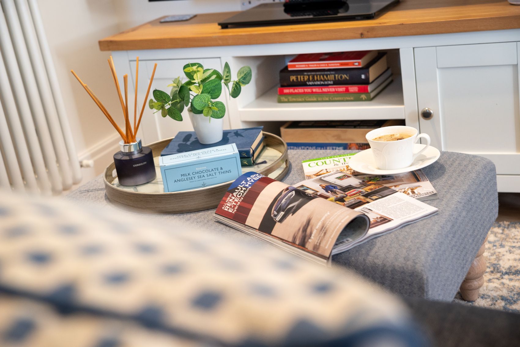 On the ground floor is a modern open plan living space, the layout is carefully set out so that there is a dedicated kitchen area, cosy dining corner complete with cocktail bar and a sitting area with comfortable chair, sofa and footstool.
